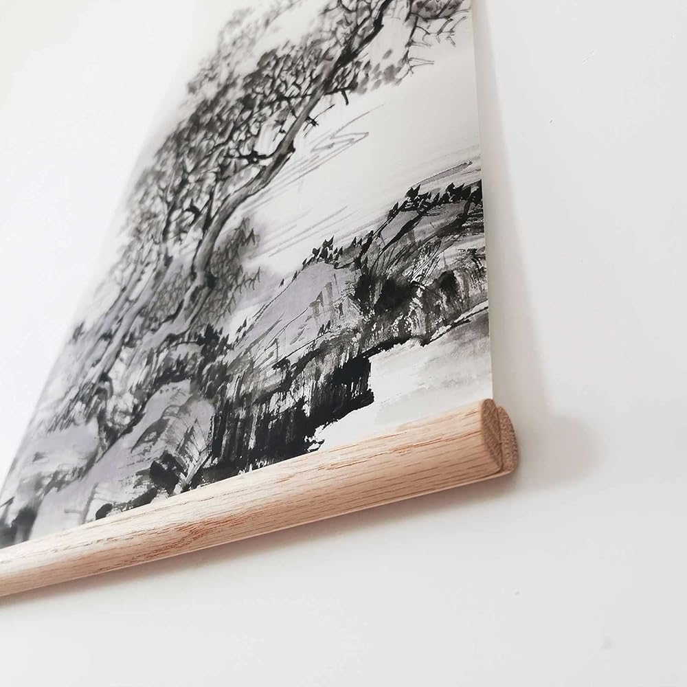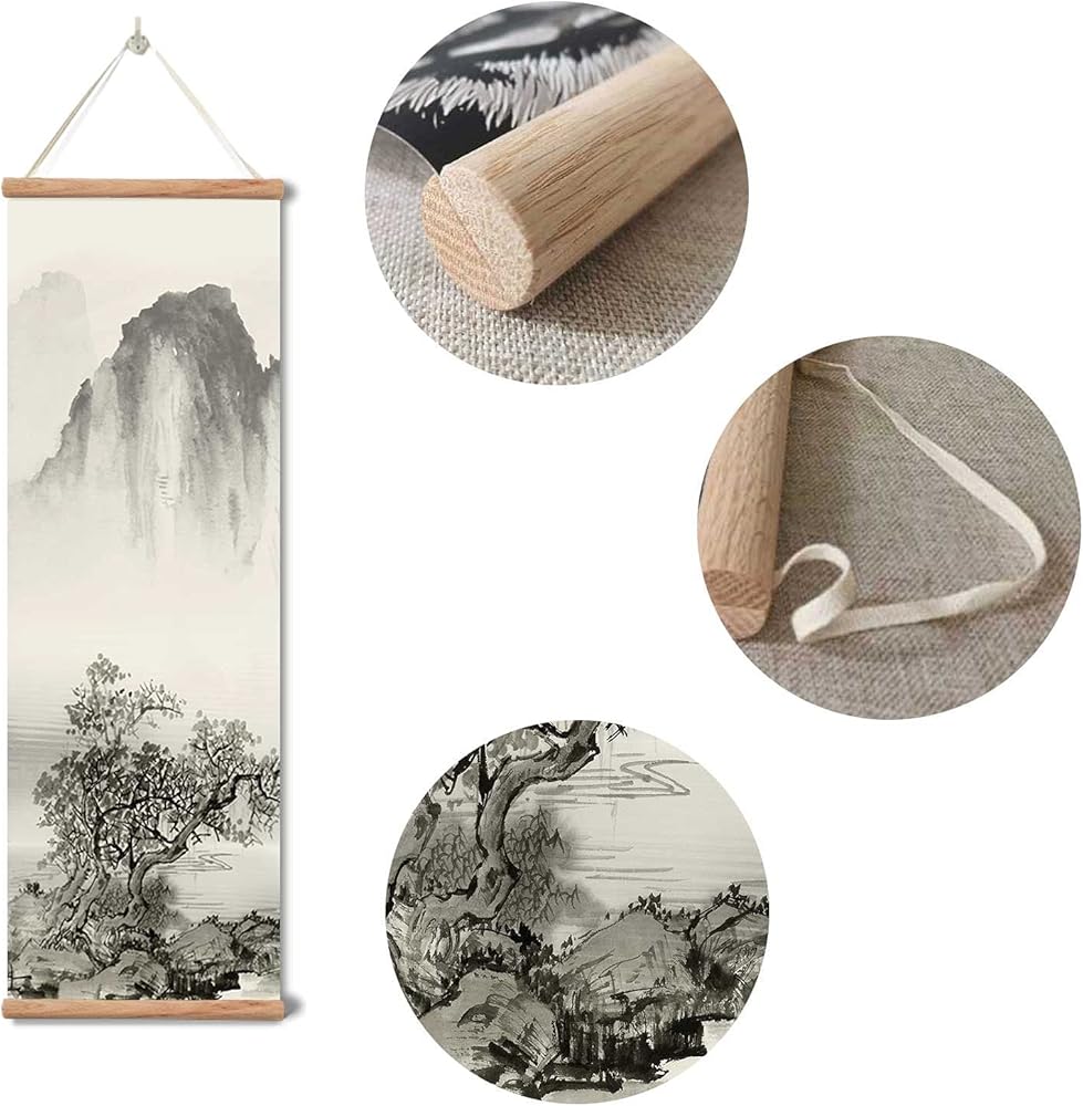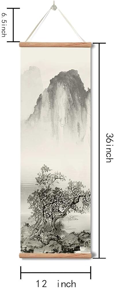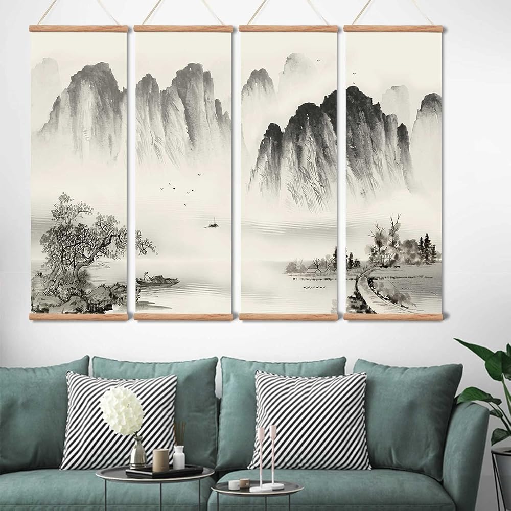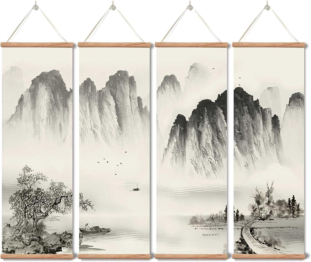 لوحة المناظر الطبيعية ، جدار الفن الأسود والأبيض لغرفة المعيشة غرفة النوم ، ديكور الحبر الصيني التقليدي ، الملصقات والطباعات، مجموعة 4 قطع لوحة خشبية ثابتة معلقة (12 بوصة × 36 بوصة × 4 قطع)