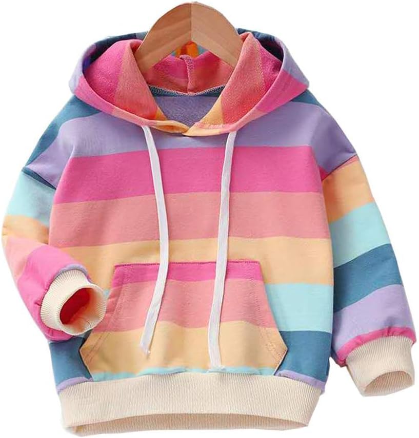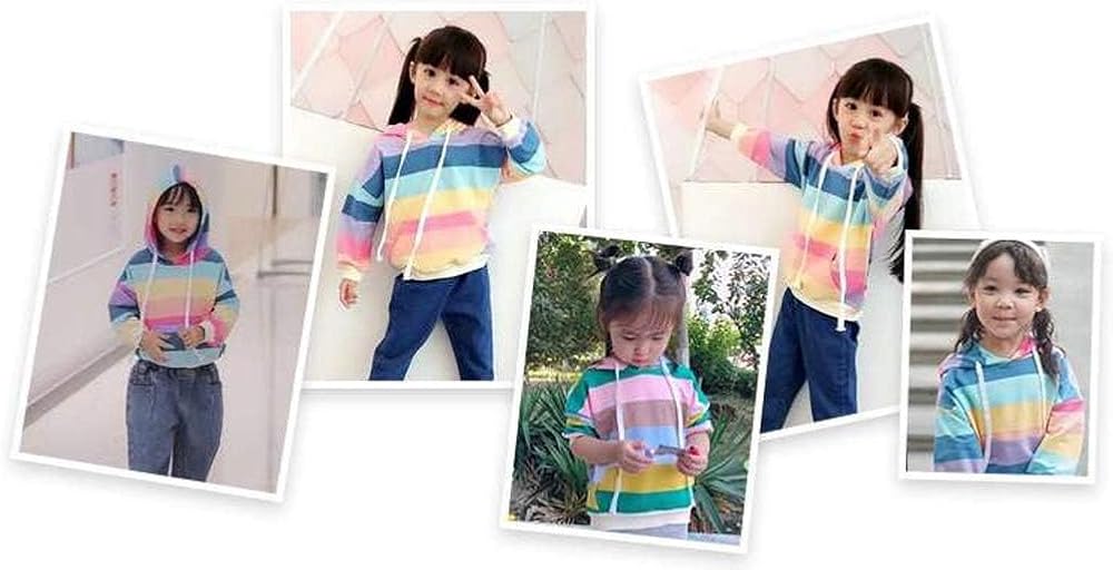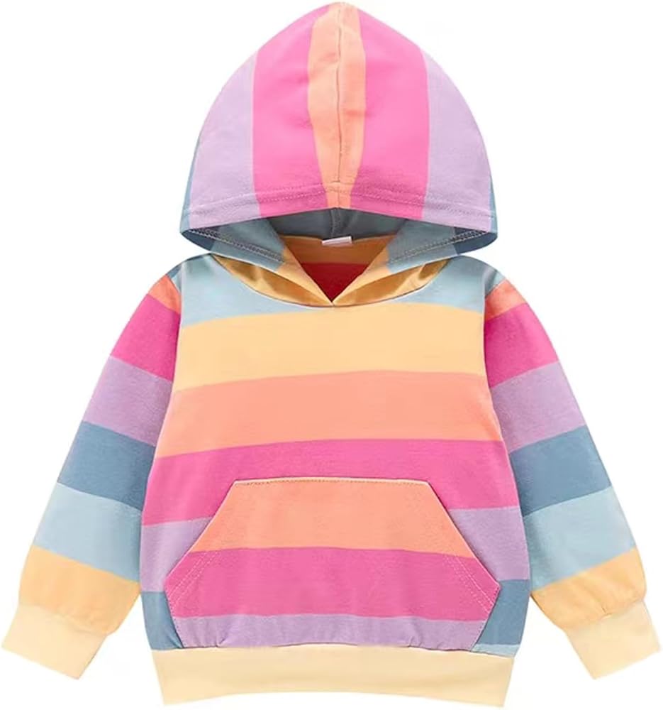 التصميم - تتميز سترة الخريف للأطفال بجيب كنغر أمامي، مثالية للحفاظ على دفء اليد، وأكمام طويلة، ورقبة دائرية، وقلنسوة برباط، وسويت شيرت مخطط بألوان قوس قزح، وأساور أكمام وحاشية مرنة، سويت شيرت بألوان جديدة للفتيات الصغيرات