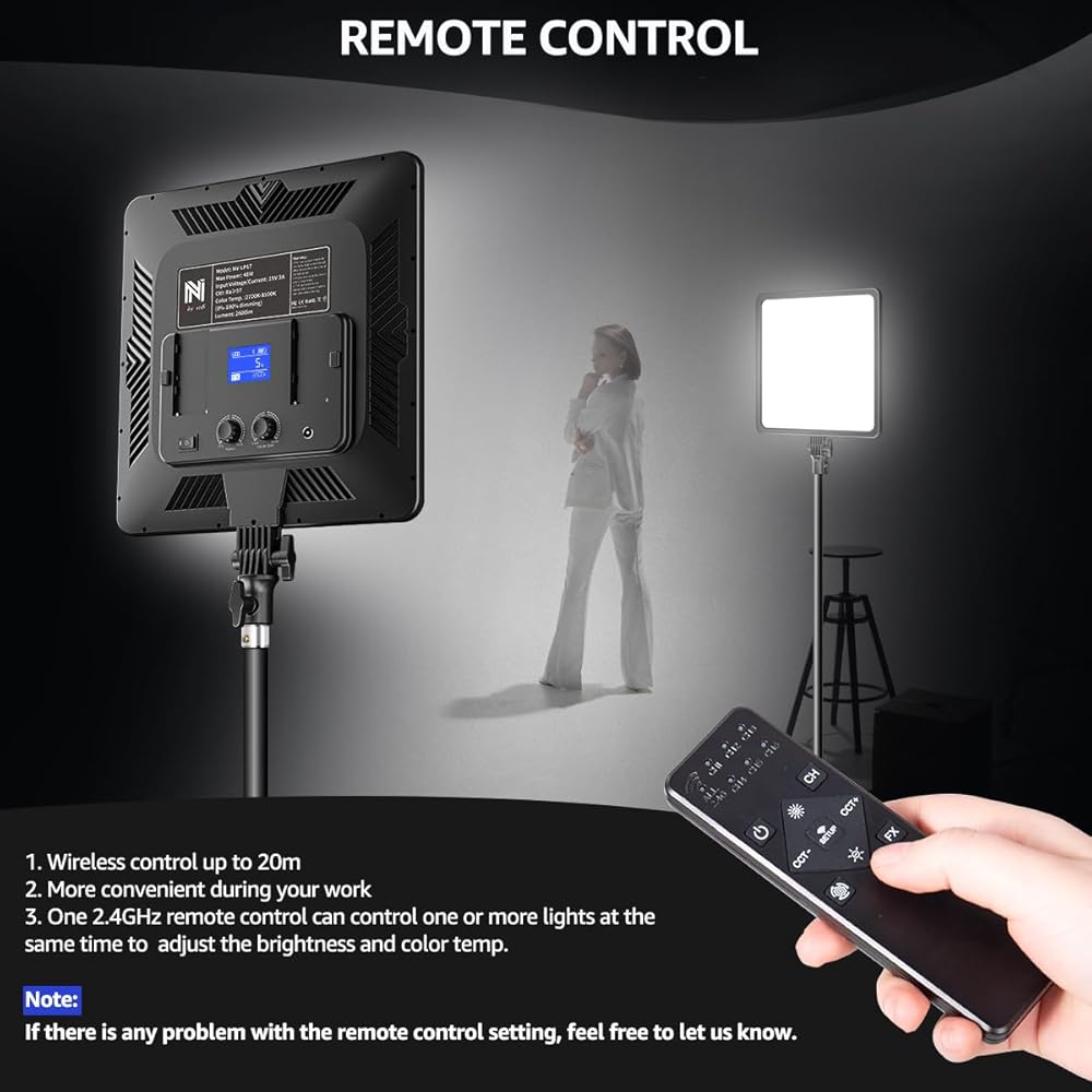 【قابلة للتعديل بشكل مريح】شاشة عرض LCD الكبيرة الموجودة على الجزء الخلفي من رأس ضوء الاستوديو تظهر بوضوح درجة حرارة اللون والسطوع وحالة طاقة البطارية للضوء وهو مناسب لعملك. باستخدام مقابض التبديل، يمكنك ضبط درجة حرارة اللون والسطوع بسهولة. مجهزة أيضًا بجهاز تحكم عن بعد لضوء التصوير. لا داعي للقلق من ضبط الحامل ثلاثي القوائم للتحكم مباشرة عن بعد في وضع لوحة الإضاءة أثناء عملك.