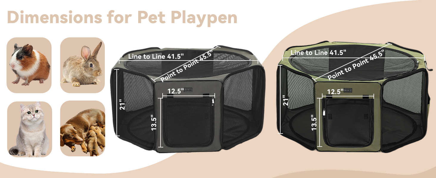 【حجم قفص لعب الجراء 】حجم نقطة إلى نقطة 45.5 بوصة (القطر) × 21 بوصة (الارتفاع). حجم الخط إلى الخط: 41.5 بوصة طول × 41.5 بوصة عرض × 21 بوصة ارتفاع. الحجم عند الطي: 19 بوصة طول × 2.3 بوصة عرض × 23 بوصة ارتفاع. الباب: 12.5 بوصة عرض × 13.5 بوصة ارتفاع. مناسب للحيوانات الصغيرة إلى المتوسطة، مثل الكلاب والقطط والأرانب، مما يوفر مساحة أكبر لهم للعب بدون وزن. حد.