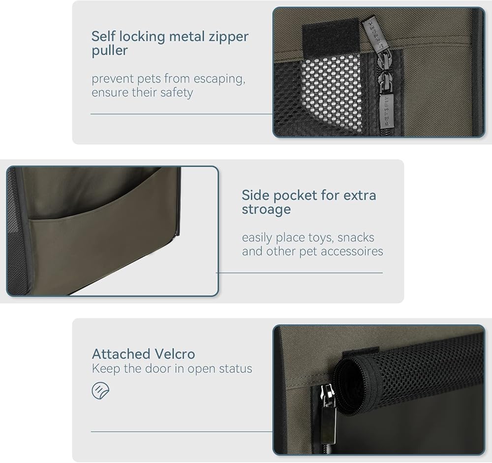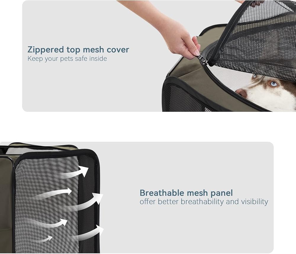 【تهوية متينة وممتازة】توجد 4 نوافذ شبكية وأبواب واحدة حتى تتمكن من الحيوانات الأليفة وإطعامه دون فتح السقف. يتم إغلاق السحاب العلوي والسفلي لسهولة الوصول والتنظيف. جزء علوي شبكي يمكن الرؤية من خلاله. الأرضية مقاومة للماء مع وجود طبقة من القماش القابل للغسل تغطي سحاب الأرضية. من السهل تخزينها في حقيبة الحمل التي تأتي بها.