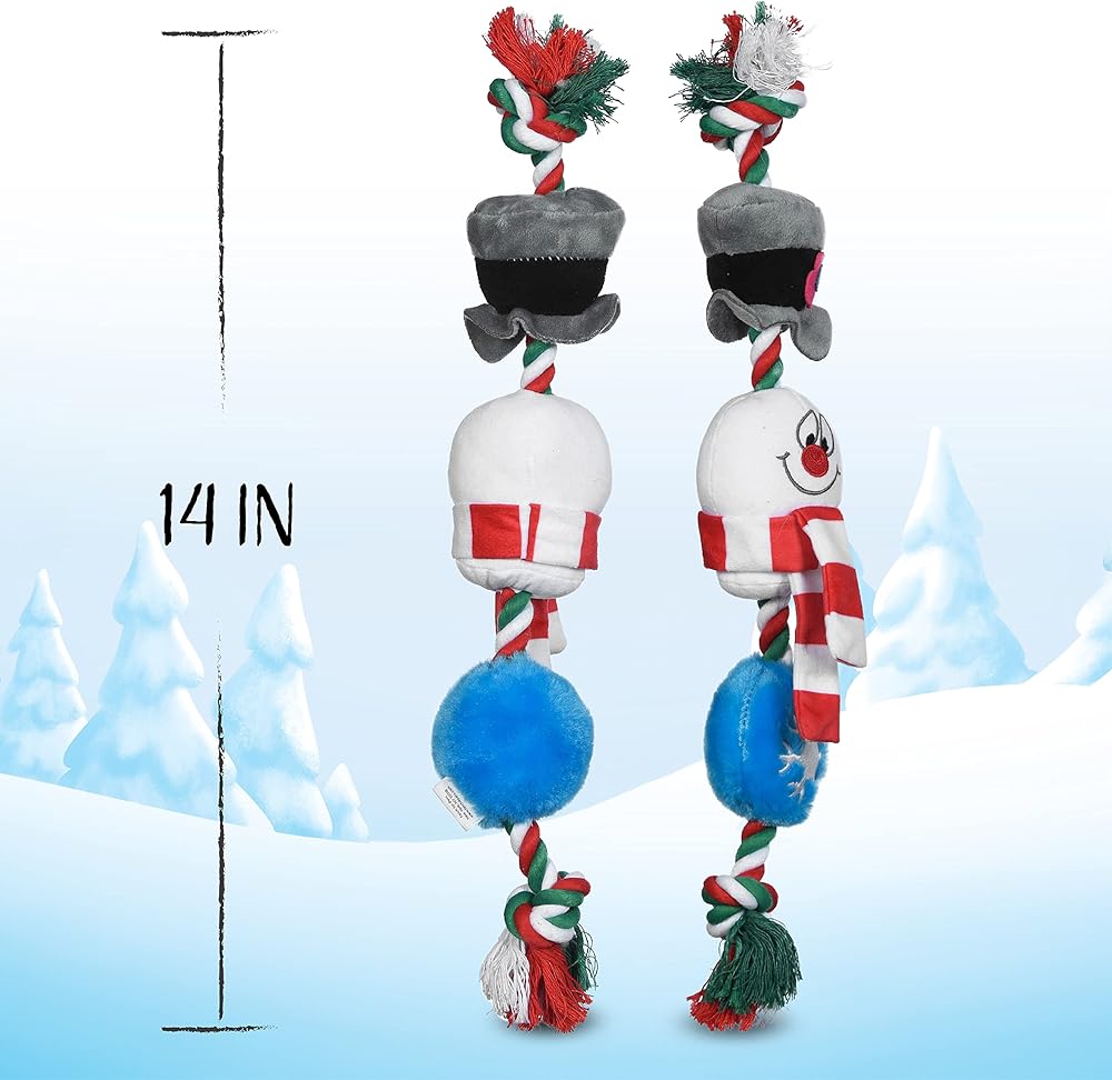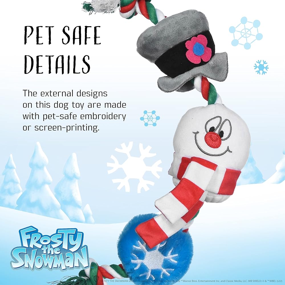 The 14” Frosty the Snowman Dog Plush and Rope Toy for dogs is the perfect way to start getting ready for a holiday movie marathon. This multisensory dog chew toy features Frosty re-imagined as a dog toy, with a sturdy tug rope and plush sliding squeaker components. The plush components are made from soft fabric and contain an internal squeaker that dogs can't resist! Plus, they slide up and down the rope, making it extra fun for dogs to tug. This Christmas themed dog toy features pet-safe plush details, meaning it has no hard plastic, sharp corners, or edges. It's best for light chewers who love to tug, toss, and carry their dog toys. This squeaky toy measures 14 inches and is perfect as a tug toy to play with your dog. All of the design details on this pet plush squeaky toy are either embroidered or screen printed. As with all dog toys, please supervise your pet when they play with this toy. What a great new way for holiday movie fans and their pets to collect their favorite characters! For a truly epic holiday, stuff your pet's stockings with Christmas plushes! For more movie-themed dog and pet toys, apparel, bowls, feeding, and accessories, browse our Fetch for Pets brand store. You're sure to find the perfect Christmas gift for dogs! Whether you're decking the halls or fetching the balls, we hope you and your furry friends enjoy time to “paws” and rejoice in your reason for the season. Happy howli-days, and may all your days be furry and bright! YOUR SATISFACTION IS OUR PRIORITY* If you have any questions or feedback on this product, please reach out to us at Fetch for Pets.