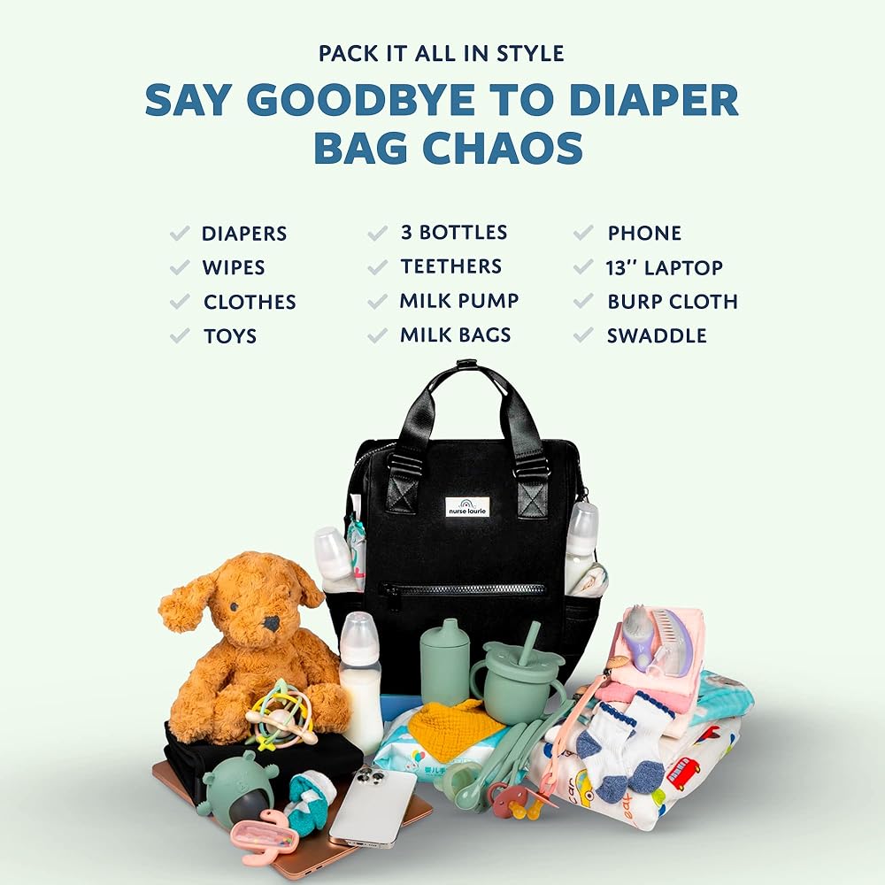 حقيبة ظهر لحفاضات الأطفال من ممرضة لوري مع وسادة تغيير الحفاضات وحقيبة حفاضات وأشرطة عربة الأطفال - متعددة الوظائف، وجيوب معزولة، وحقائب حفاضات من النيوبرين - حقيبة سفر لمستلزمات الأمومة والطفل - أسود