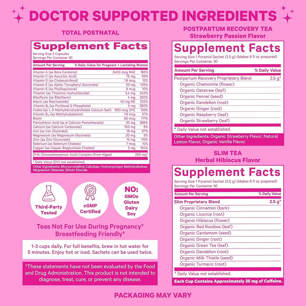 بينك ستورك توتال بعد الولادة هو مكمل أساسي بعد الولادة للنساء. تحتوي فيتامينات ما بعد الولادة للأمهات المرضعات على 20 فيتامينًا ومغذيًا أساسيًا، بما في ذلك فيتامين أ وفيتامين ج وفيتامين د وفيتامين E وفيتامين ك والثيامين (فيتامين أ) والريبوفلافين (فيتامين B2) والنياسين (فيتامين B3) وفيتامين B6 وحمض الفولات (حمض الفوليك الميثيل وليس الفولات فيفيتا) ، Vitأمين بي 12 (مثل ميثيل كوبالامين) والبيوتين وحمض البانتوثنيك والكالسيوم والحديد والمغنيسيوم والزنك والسيلينيوم والنحاس ودي اتش ايه (حمض الدوكوساهيكسينويك). توتال بعد الولادة هو فيتامين يومي للنساء بعد الولادة؛ يجب على النساء المرضعات الاستمرار في تناوله طالما أنهن مرضعات. فيتامينات ما بعد الولادة ضرورية لطقوس ما بعد الولادة وتعمل بشكل أفضل جنبًا إلى جنب مع خط منتجات ما بعد الولادة بالكامل من بينك ستورك بما في ذلك دعم الحالة المزاجية بعد الولادة أو شاي التعافي بعد الولادة أو سيتز بعد الولادة أو علكة تساقط الشعر بعد الولادة أو شاي التخلص من السموم بعد الولادة. إذا كنتِ تبحثين عن بديل، جربي علكة فيتامين ما بعد الولادة القابلة للمضغ! كما نقدم مجموعة كاملة من مكملات الرضاعة للنساء المرضعات، بما في ذلك مكملات الرضاعة الطبيعية الكاملة (مع الحلبة أو بدونها)، وحلويات الرضاعة، ومكملات الرضاعة للأمهات، وشاي الرضاعة، ومزيج مشروبات الرضاعة، والبروبيوتيك للرضاعة.