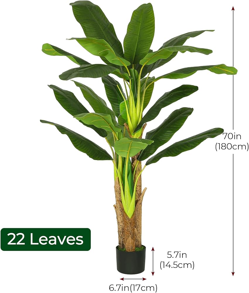 • 【محاكاة نابضة بالحياة】تم تصميم شجرة الموز الاصطناعية هذه التي يبلغ طولها 6 أقدام (70 انش/180 سم) بعناية لمحاكاة مظهر شجرة الموز الحية، وتبدو قريبة من الواقع قدر الإمكان. جذوع ثلاثية مزينة بـ 22 ورقة موز كبيرة، هذه الشجرة الصناعية تخلق انطباعًا مثيرًا عن الجمال وطول العمر والأناقة. أوراق الموز المزخرفة بوضوح والألوان الزاهية تجعل هذه الشجرة المزيفة ديكور منزلي موسمي لا يتأثر بمرور الزمن.