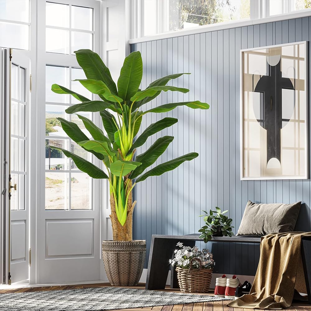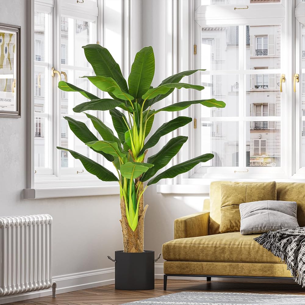 فياجدو شجرة موز اصطناعية بطول 6 قدم مكونة من 22 ورقة كبيرة ثلاثية الساق من الحرير الصناعي لتزيين المنزل والمسافرين داخليا، شجرة نخيل لتزيين غرفة المعيشة