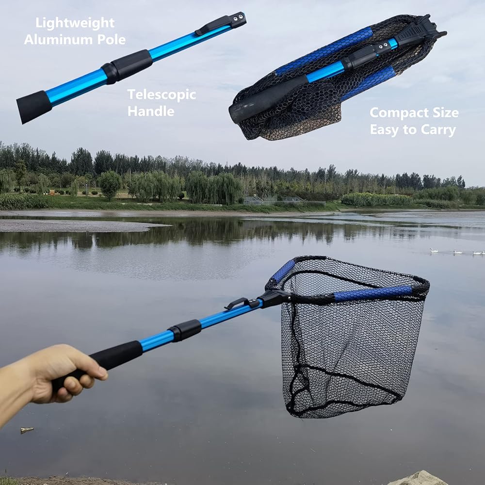 شبكة مطاطية ومقبض ألومنيوم خفيف الوزن - شبكة الصيد مصنوعة من مقبض ألومنيوم خفيف الوزن عالي الجودة، ليس من السهل الانحناء أو الكسر. شبكة صيد مطاطية مقاومة للماء ستحافظ على سلامة الأسماك عند الإمساك والإطلاق.