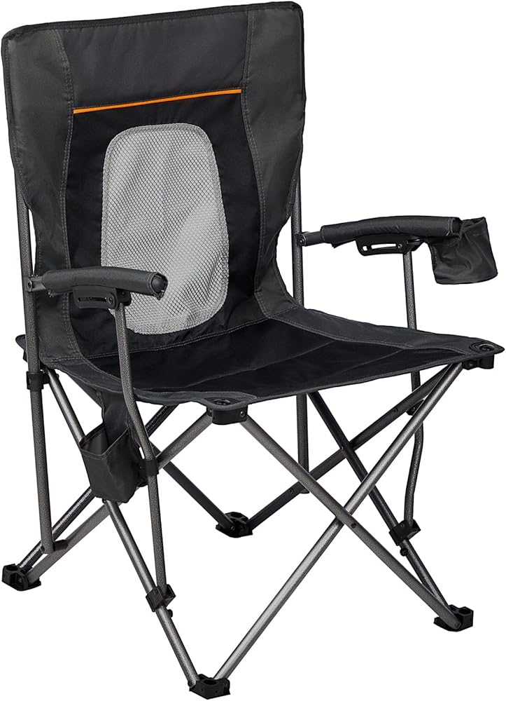 Find comfort and convenience all in one chair with the Portal Outdoor Quad Folding Camping Chair. This quad folding chair is built to last with a strong steel frame, durable polyester, and a breathable honeycomb mesh seat back for added comfort. The stylish black outdoor chair features padded hard armrests for increased comfort and to make getting in and out of the seat much easier than typical camping chairs. For your convenience, this chair features a swing away cup holder and a built-in storage pocket for important items to keep your drink, phone, and other necessities close by. The included carry bag also makes this easy-to-transport chair the perfect companion for camping, tailgating, concerts, or other outdoor activities. With a weight capacity of 300 lbs., the compact chair measures 23.6" x 18.5" x 36.6" when set up and only 8.66" x 9" x 39" when folded with a weight of 9.65 lbs. so you can maximize space when transporting it to the campsite or storing at home.