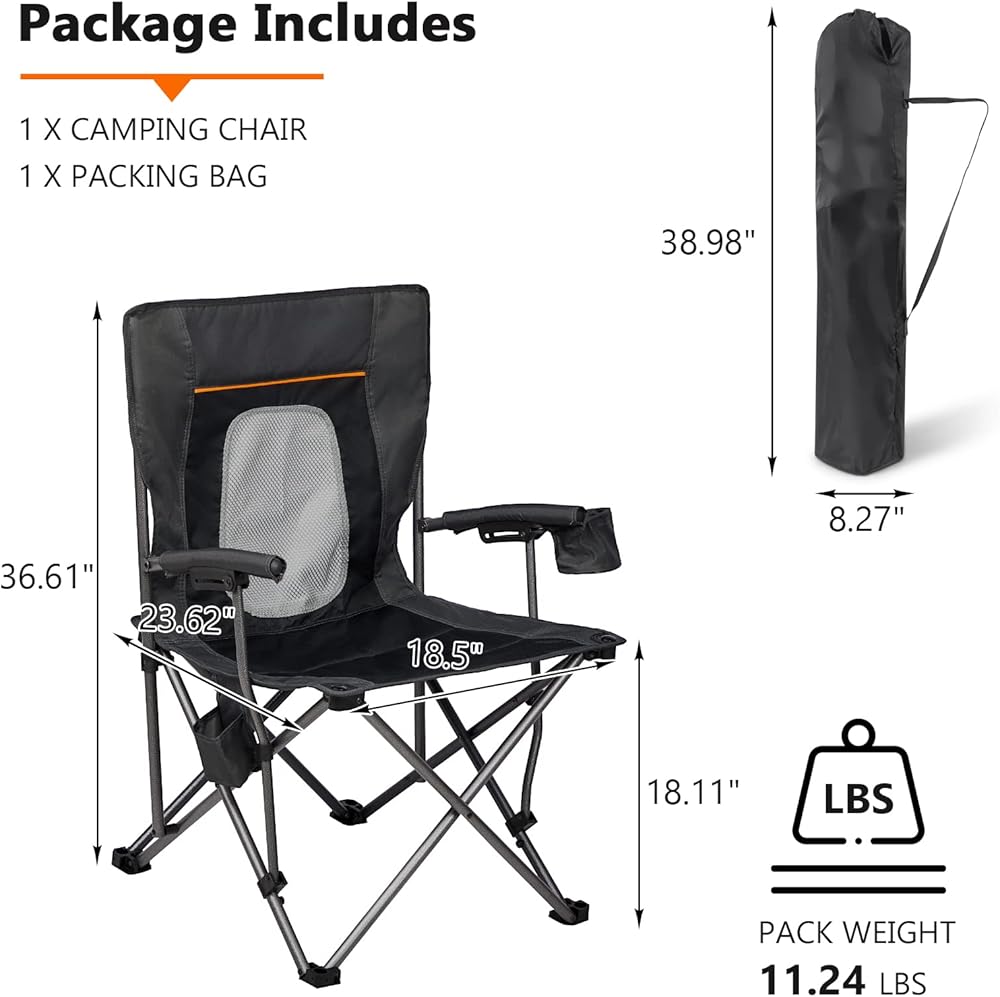⭐️ Dimensions- The portable camping chair's set up size is 18.5" L x 23.6" W x 36.6" H, folding size is 38 L x 8.3" W, support up to 300lbs