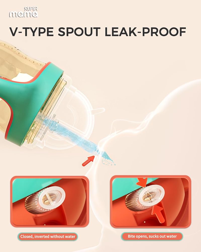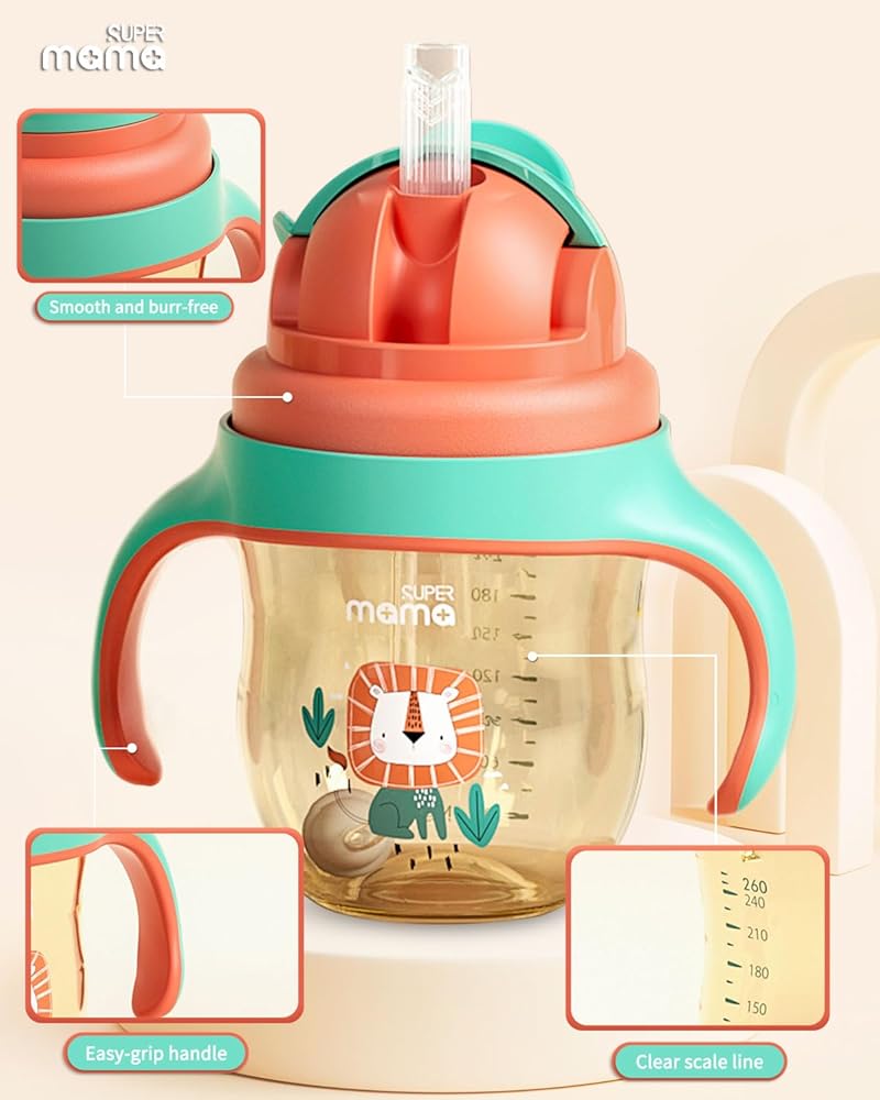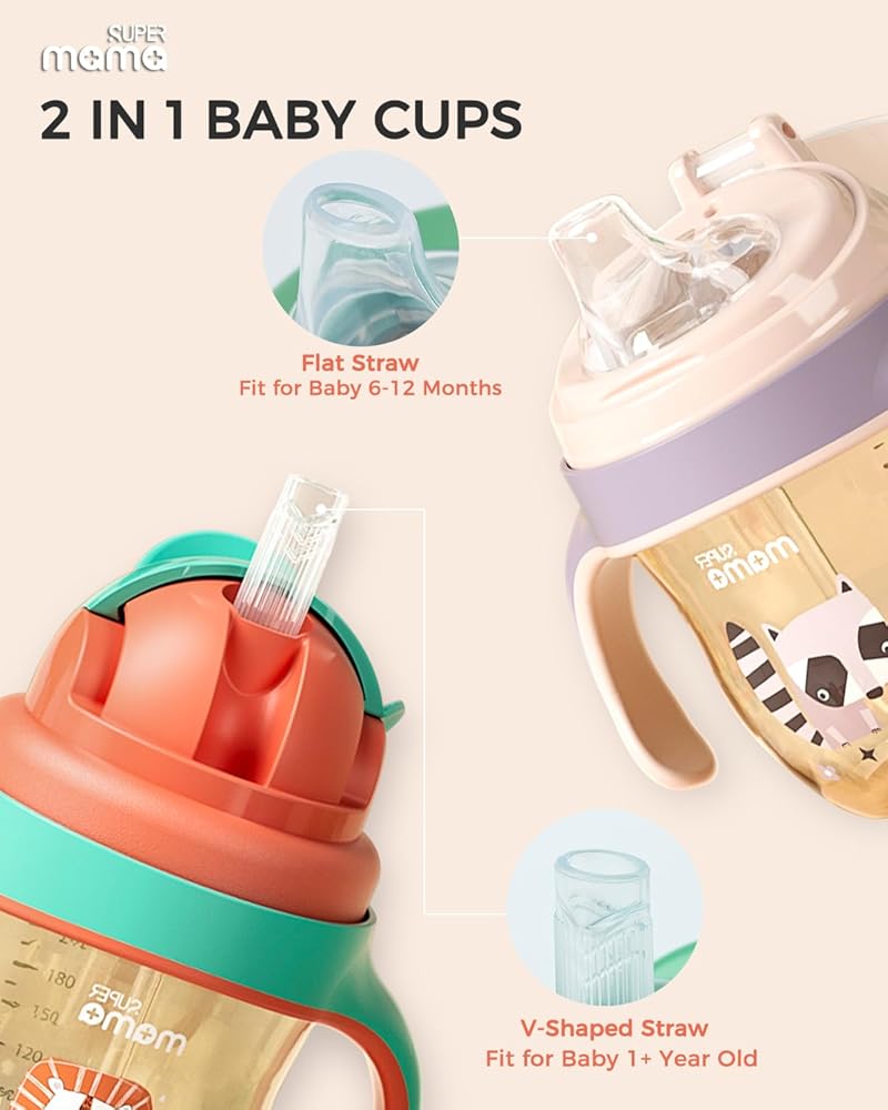 🍼 نقدم لك كوب الطفل الأول المبتكر من SUPERMAMA، المصمم بدقة لتسهيل انتقال طفلك من الزجاجات. تتميز بفوهتين مميزتين: شفاطة مسطحة تشبه اللهاية، مناسبة للمبتدئين الذين تتراوح أعمارهم بين 6 إلى 12 شهرًا، وقشّة على شكل حرف V للمتعلمين المتقدمين الذين تتراوح أعمارهم بين 1 إلى 3 سنوات، مما يعزز مهارات العض والاحتساء.