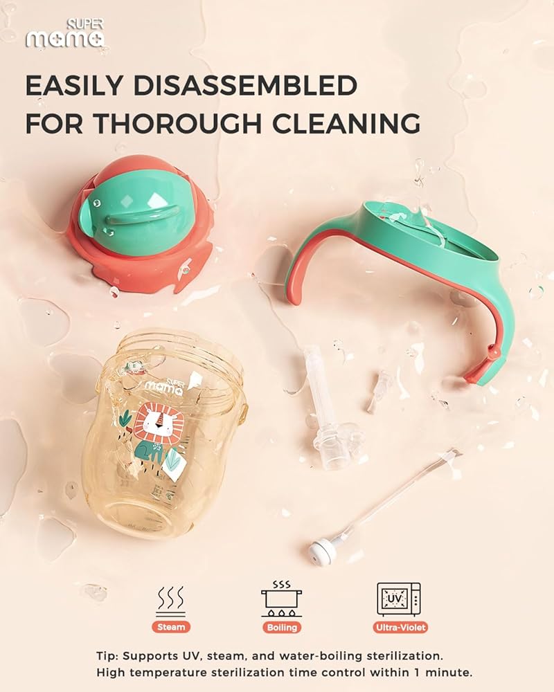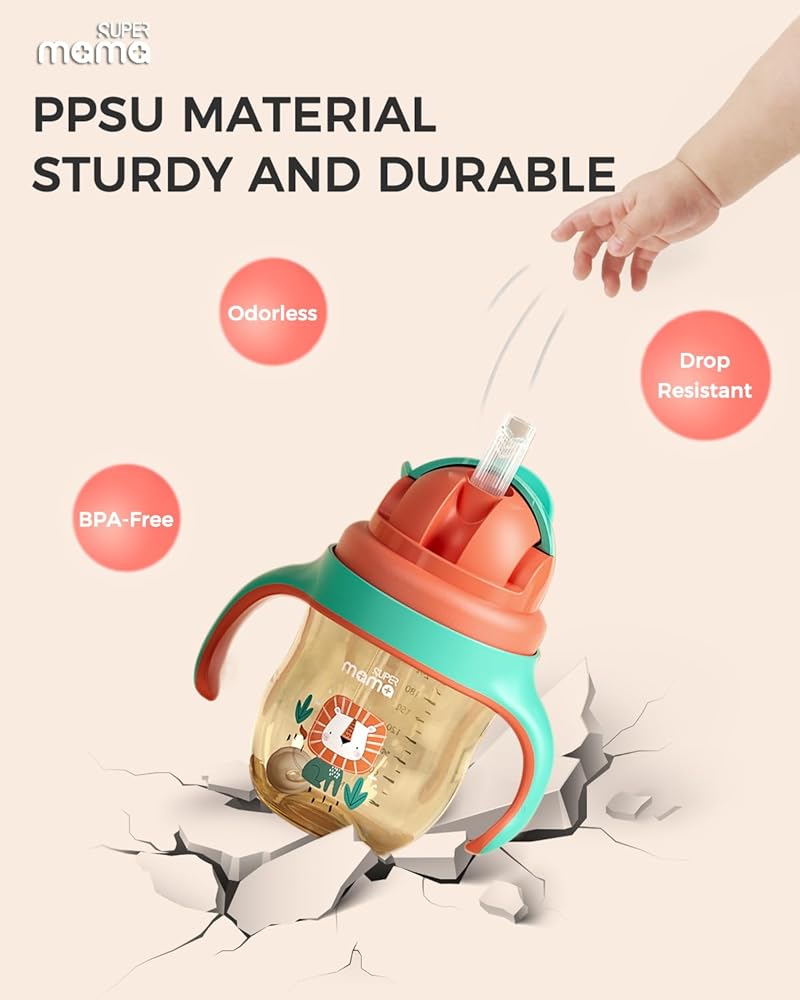 🍼 تعد السلامة والكفاءة أمرًا بالغ الأهمية في تصميم أكواب الشرب للأطفال الصغار من سوبر ماما. لقد تم تصنيعها بلون ذهبي، وجسم PPSU خالٍ من مادة BPA، مما يوفر مقاومة فائقة للحرارة تصل إلى 365 درجة فهرنهايت وقوة ملحوظة لتحمل السقوط والانزلاق العرضي بواسطة الأيدي الصغيرة.