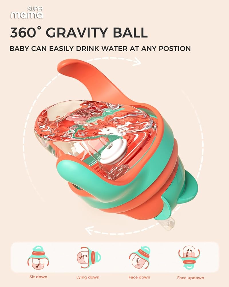 🍼 يتضمن التصميم المبتكر للكوب كرة جاذبية فريدة تسمح لطفلك بالشرب في أي وضع - الجلوس أو الاستلقاء أو المشي، مما يوفر الراحة والمرونة الأمثل. تسمح علامة المقياس المفيدة الموجودة على الزجاجة بمراقبة كمية المياه بدقة.
