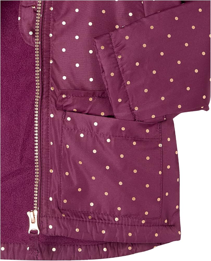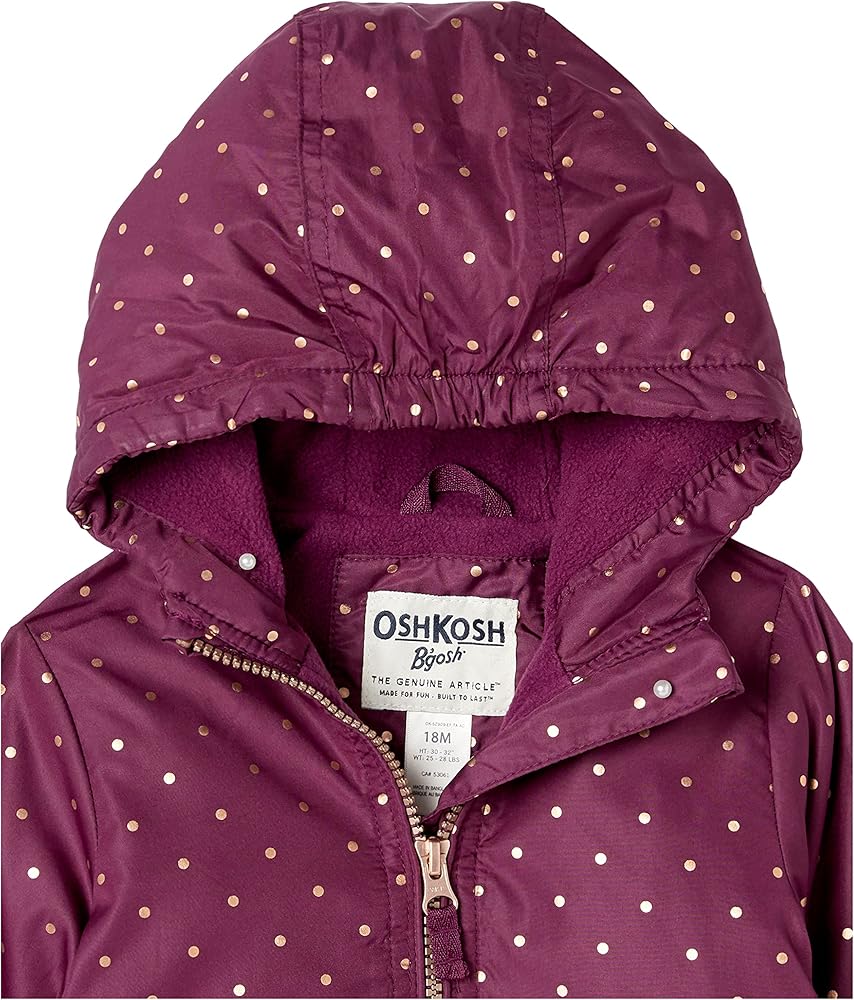 Perfect baby girl midweight winter jacket that you and your baby girl will love! Keeps them warm on a cold winter day and has all of the features you expect in an OshKosh B'Gosh jacket including an attached hood, fleece lining, full zip front, two pockets, and stylish metallic butterfly print design