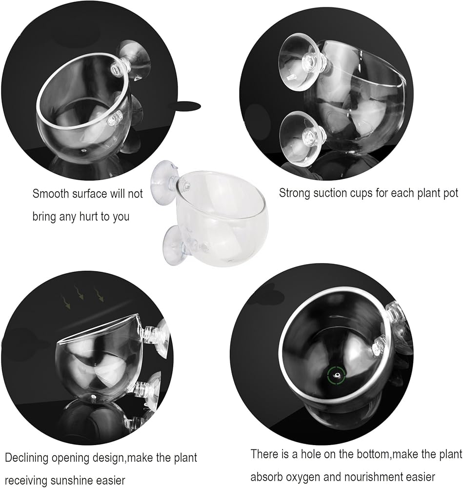 • شفاط قوي -- وعاء زجاجي للنباتات لحوض السمك مصمم بكوبين شفط متصلين بقوة، سهل الحركة والتعليق بإحكام على حوض السمك؛