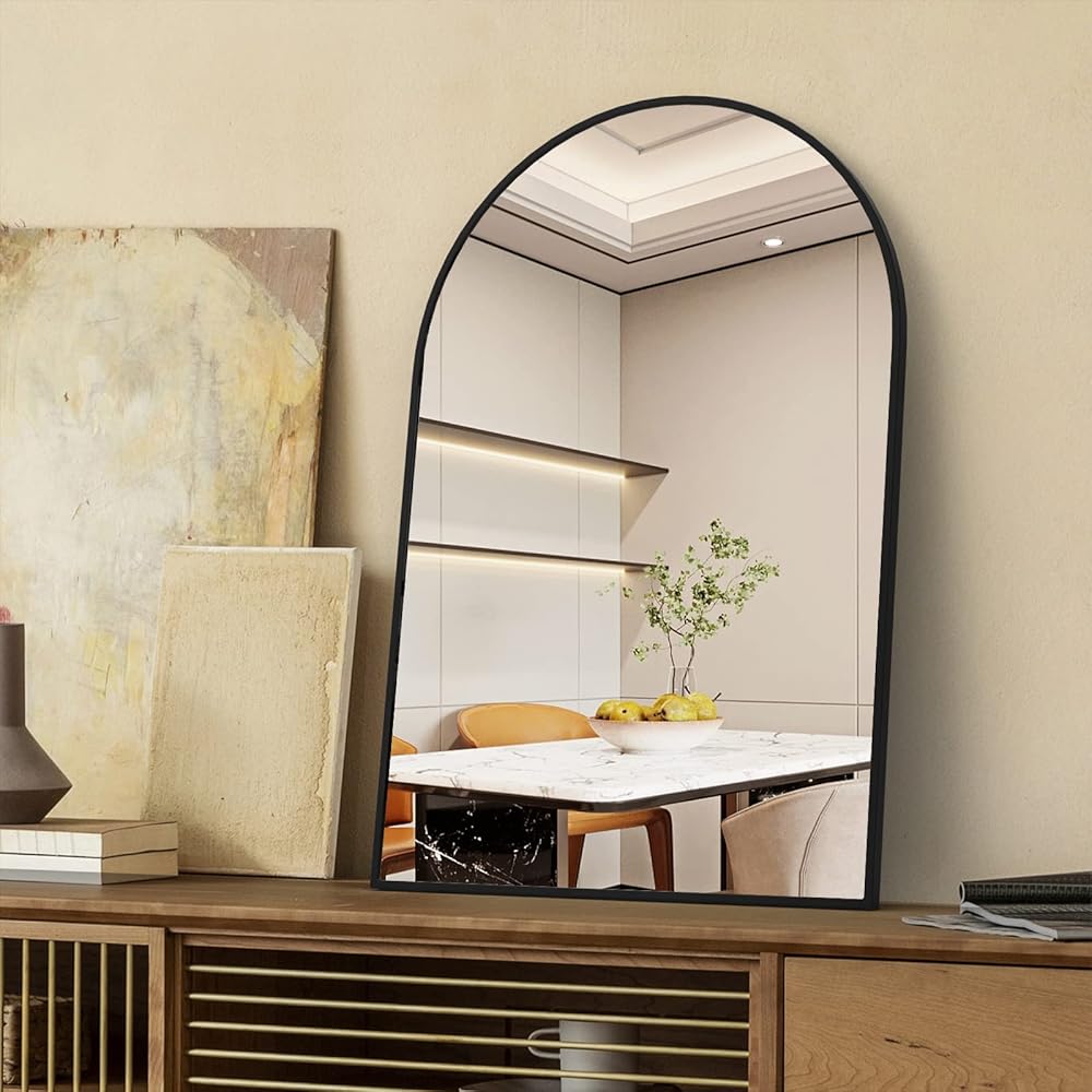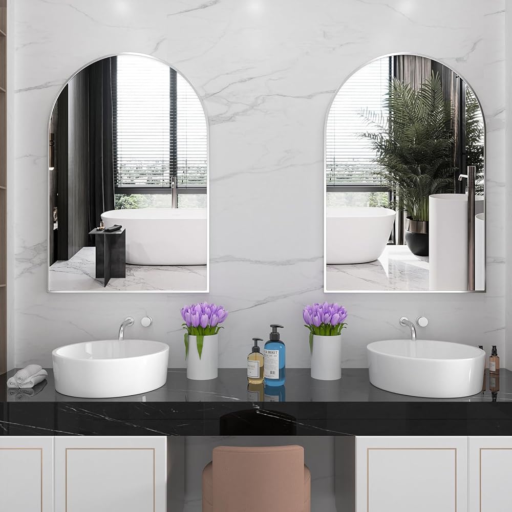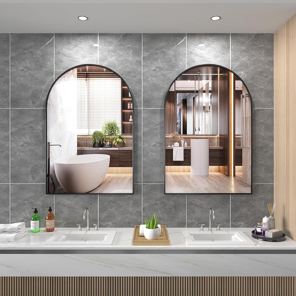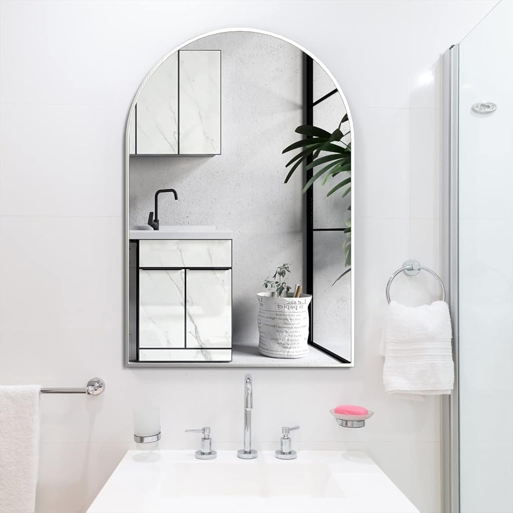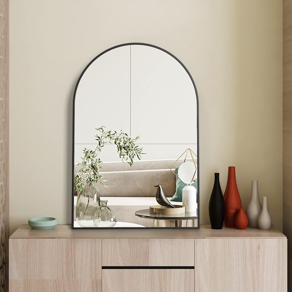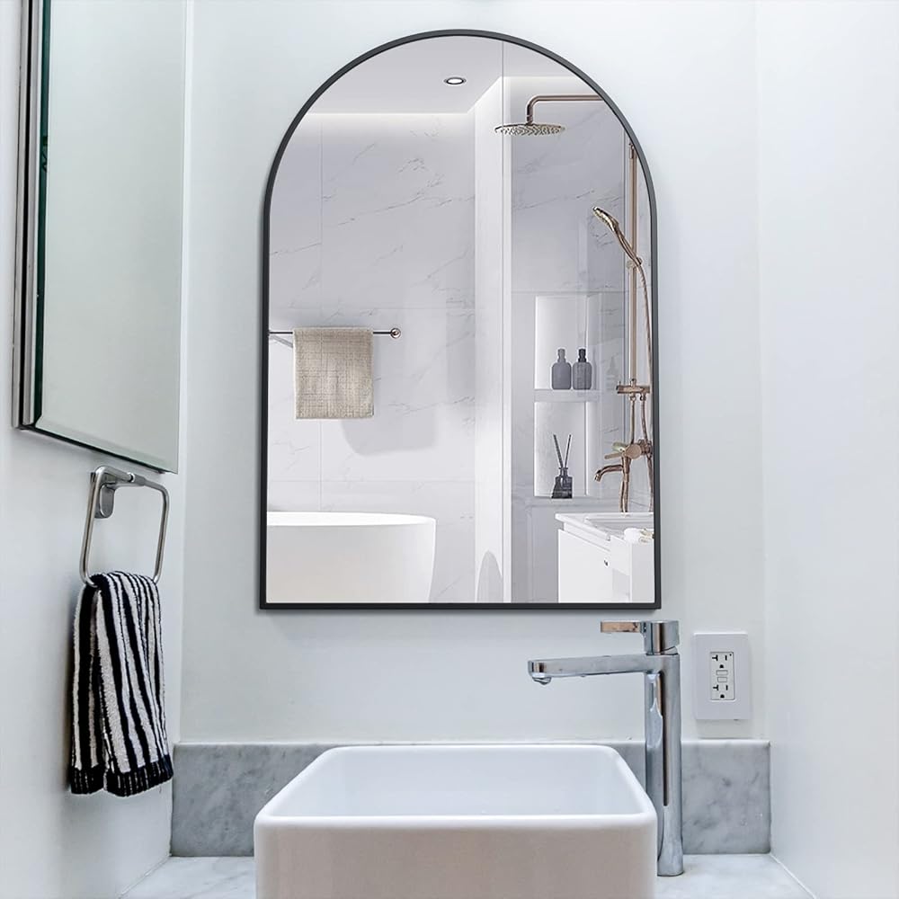 【مرآة حائط مقوسة رائعة】مرآة حائط مقوسة حديثة ومعاصرة مع إطار معدني مصقول مناسبة لأسلوب تصميم عائلتك. مثالية لمرآة مكياج الحمام المزخرفة لجعل المساحة أكثر إشراقًا وواسعة.