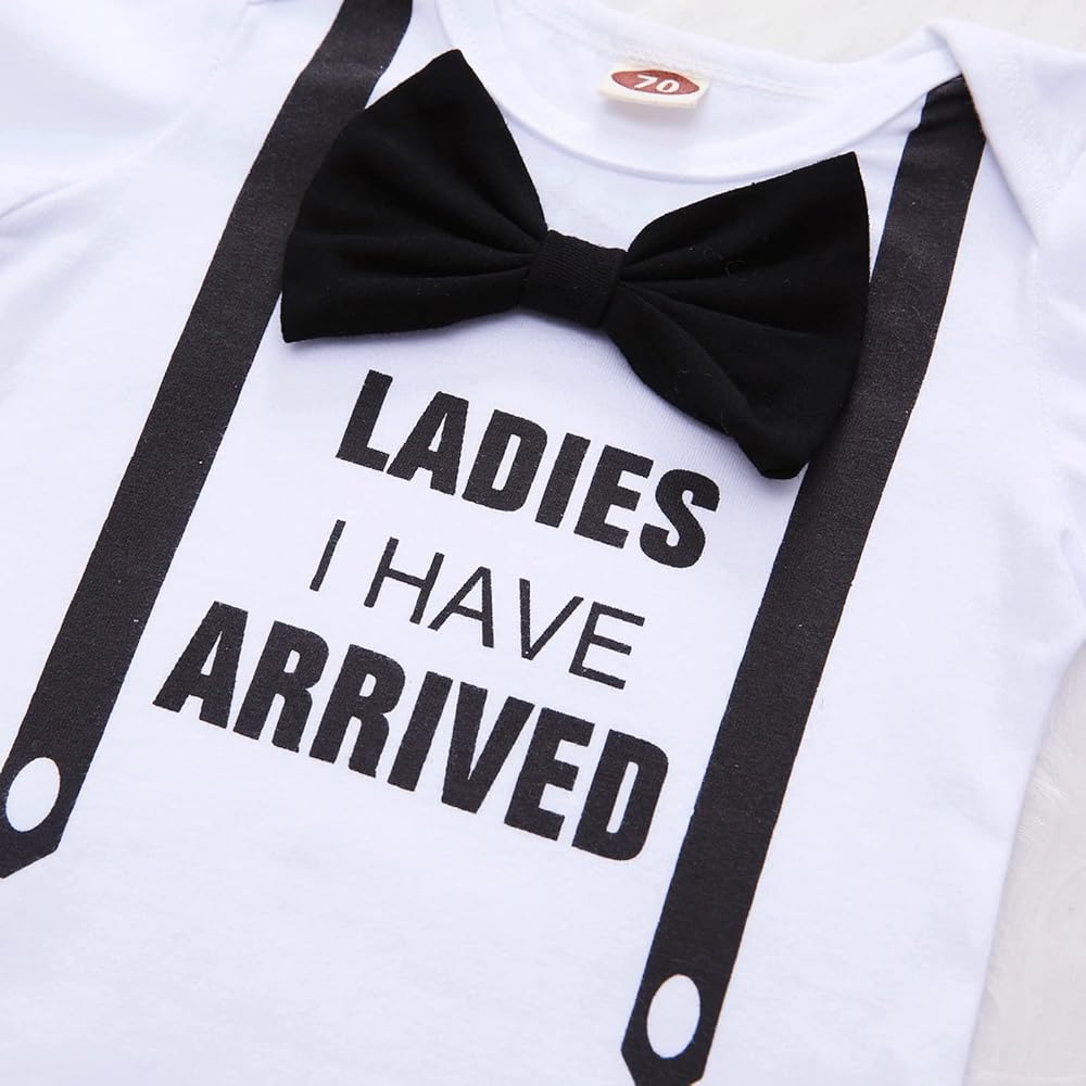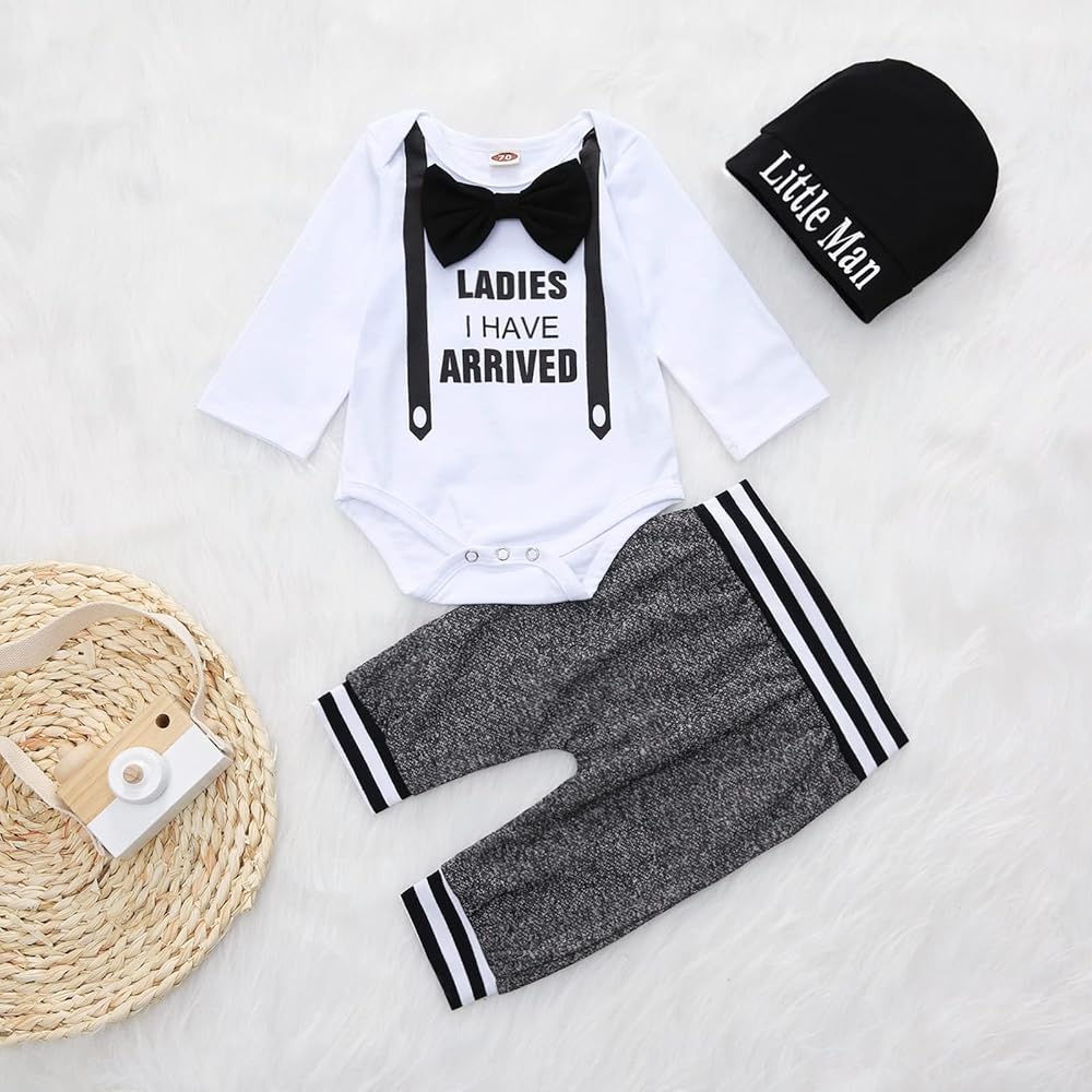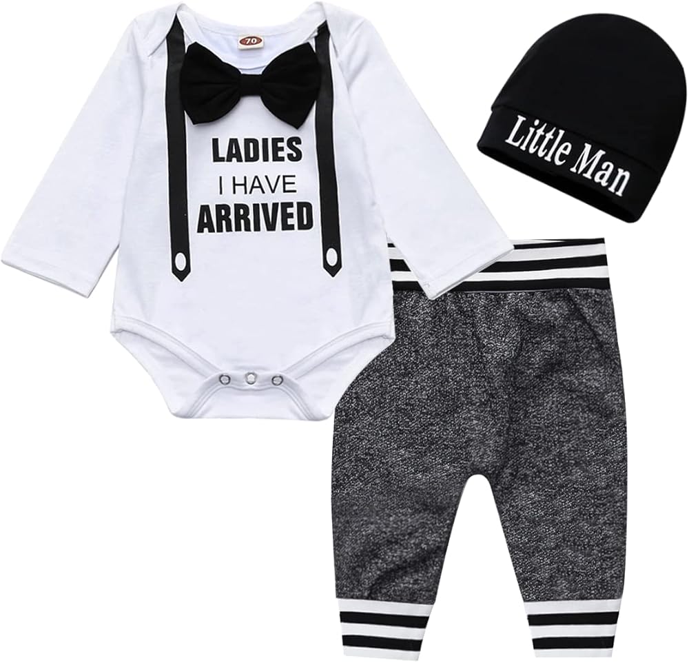 • ✈ Various Funny Alphabets Design: Infant boy clothes set was designed very meaningful alphabets such as new to the crew, ladies i have arrived is a perfect fitting for a new family, you may hardly wait to see your lovely baby boy in it, and photoshoots to keep those memorable moments. Mustache, camouflage, dinosaur, gentleman bow tie, and double strap pattern were also printed, your little baby boy will love to wear it. It will look super adorable, fashionable.