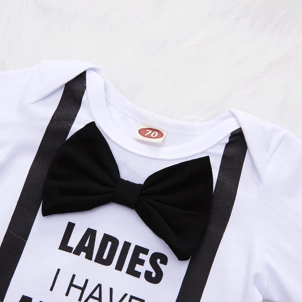 ☁ Gentleman bow tie and double strap design printed on the romper top, it will look cool and fashional.