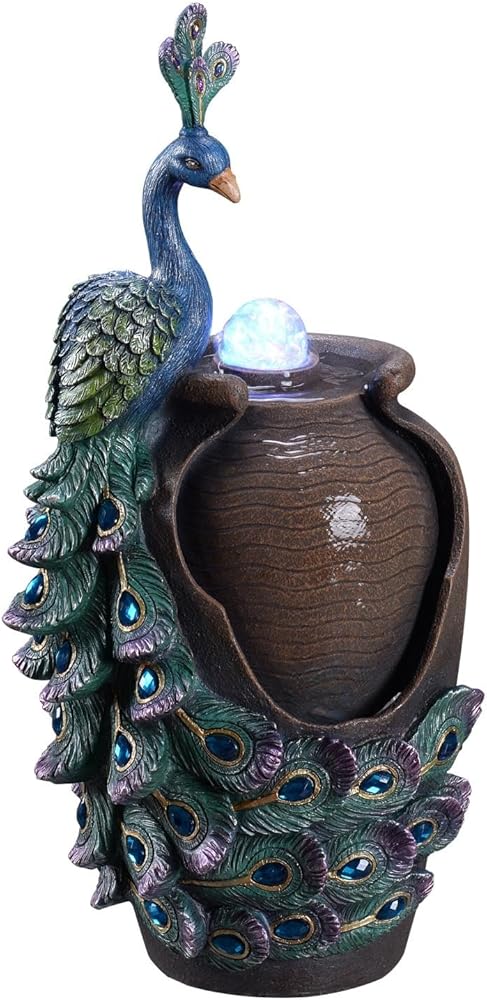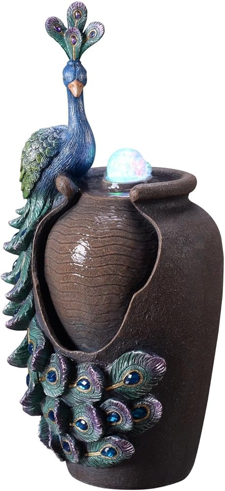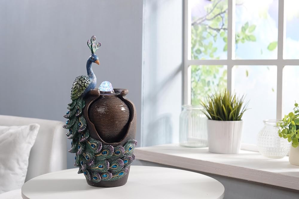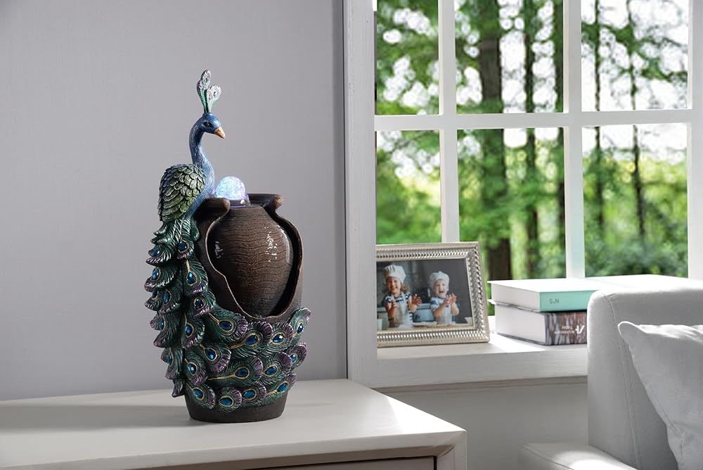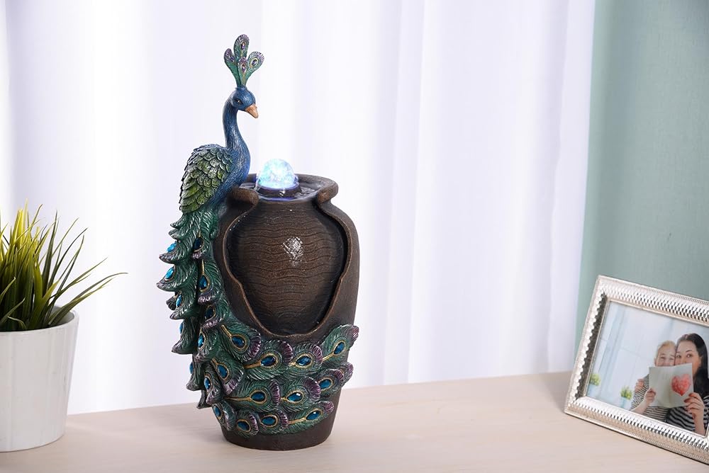 تصميم فني: ارفع مستوى الديكور الخاص بك مع هذه النوافير المكتبية الفنية، المصممة لتأسرك وتسعدك بزخارف الطاووس المعقدة والتفاصيل المرسومة يدويًا.
