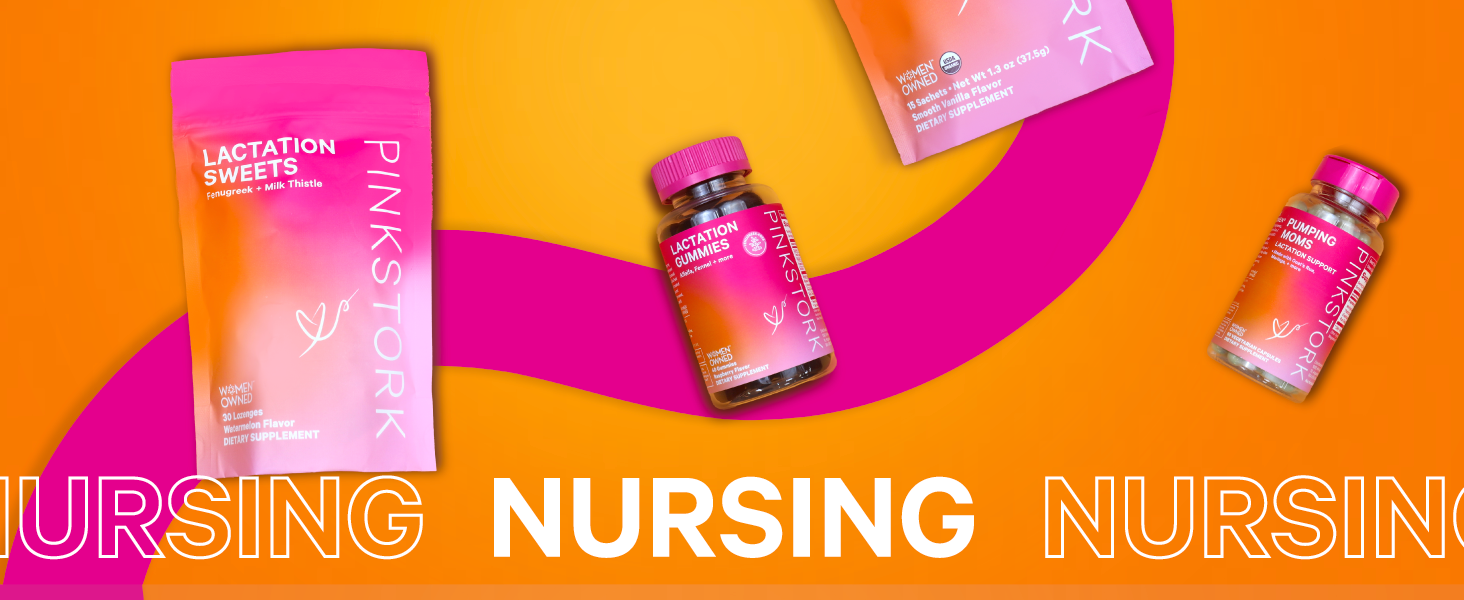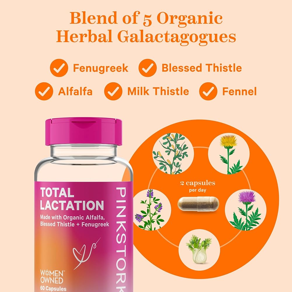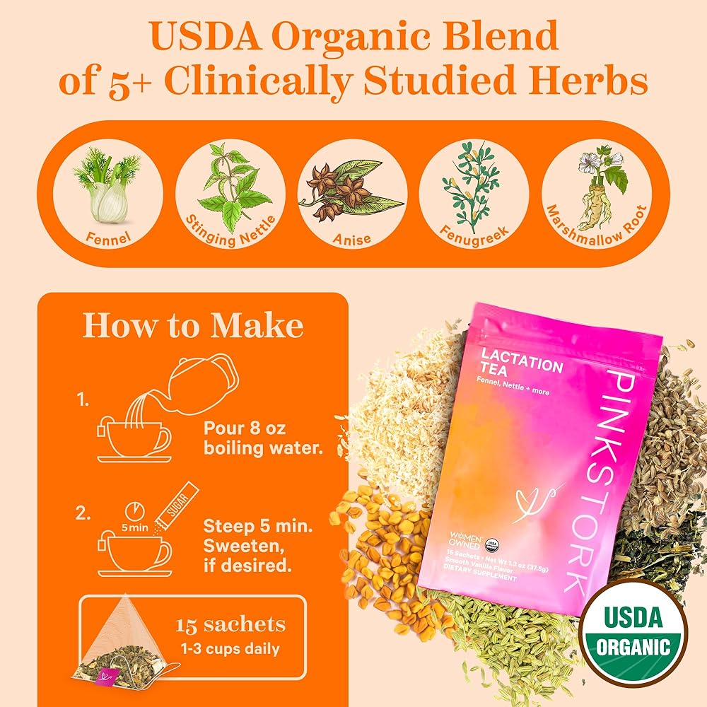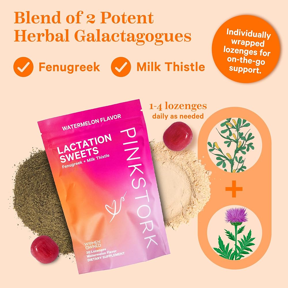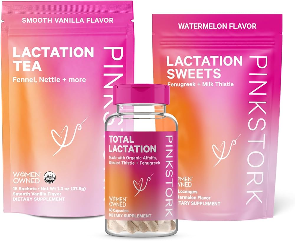 بينك ستورك مجموعة دعم الرضاعة للنساء المرضعات - مكملات الرضاعة والشاي والحلويات لتزويد حليب الثدي وتدفقه، مع الحلبة والشمر وشوك الحليب، مجموعة من 3 قطع