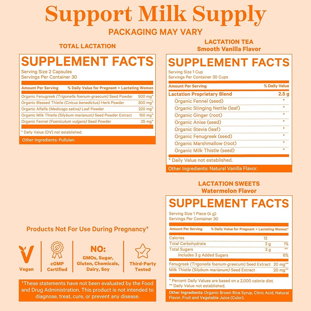 • دعم الرضاعة: تتضمن حزمة الرضاعة 3 منتجات تحتوي على فيتامينات ومغذيات أساسية لدعم الرضاعة. يمكن استخدام جميع المنتجات معًا للحصول على أفضل النتائج. من أجل الرضاعة الكاملة، تناول كبسولتين صغيرتين في اليوم، بإجمالي 60 كبسولة نباتية، كمية تكفي لمدة 30 يومًا. كل كيس شاي يصنع كوبين، إجمالي 30 كوب. لحلويات الرضاعة، تناولي 1-4 مرات يوميًا. آمنة للأم والطفل.