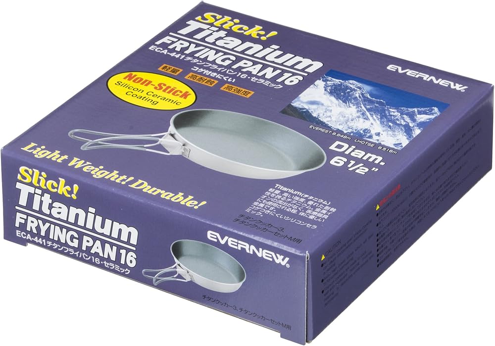 Evernew Titanium Non-Stick Fry Pan16 is made of titanium, with silicone-covered handles and silicon-ceramic non-stick coating.Winner of the 2005 Editors Choice Award. Model # Weight Dimensions Pan16 ECA441 4.2 oz. (120 g.) 6.5x1.46 in. (16.5x3.7 cm.) Pan18 ECA442 4.9 oz. (138 g.) 7.28x1.57 in. (18.5x4 cm.) Pan20 ECA443 5.5 oz. (155 g.) 8.07x1.57 in. (20.5x4 cm.)