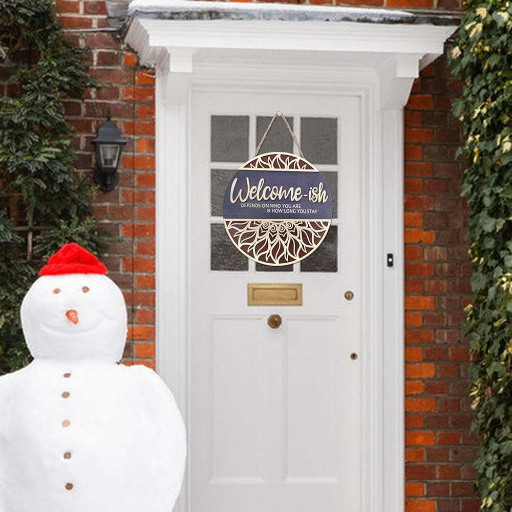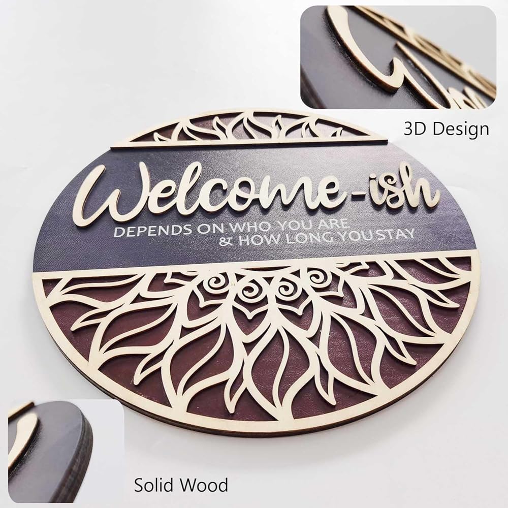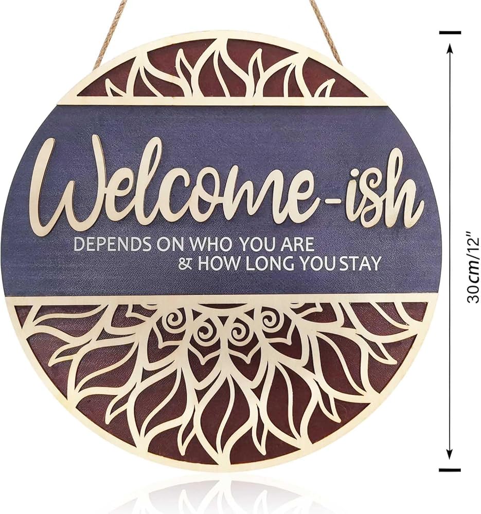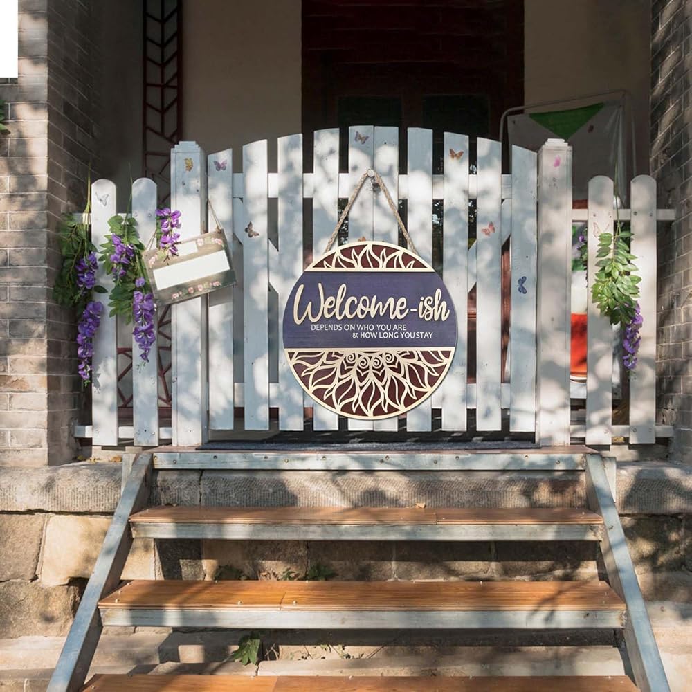 Artificial green plants and beautiful bows are manually glued on the "Welcome-ish depends on who you are & how long you stay" round wooden plate. This is a very perfect match. It can be considered the most beautiful welcome sign.