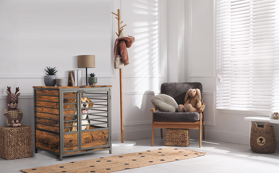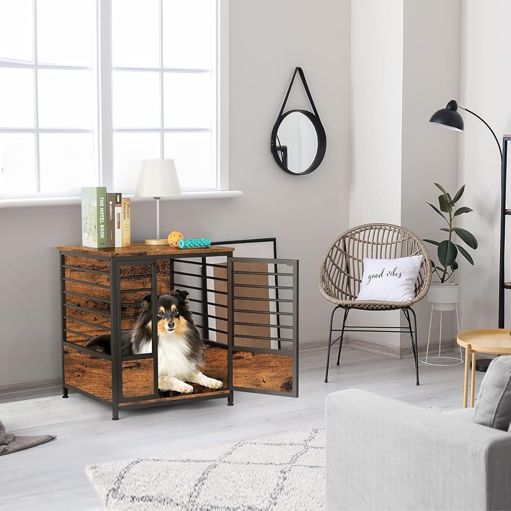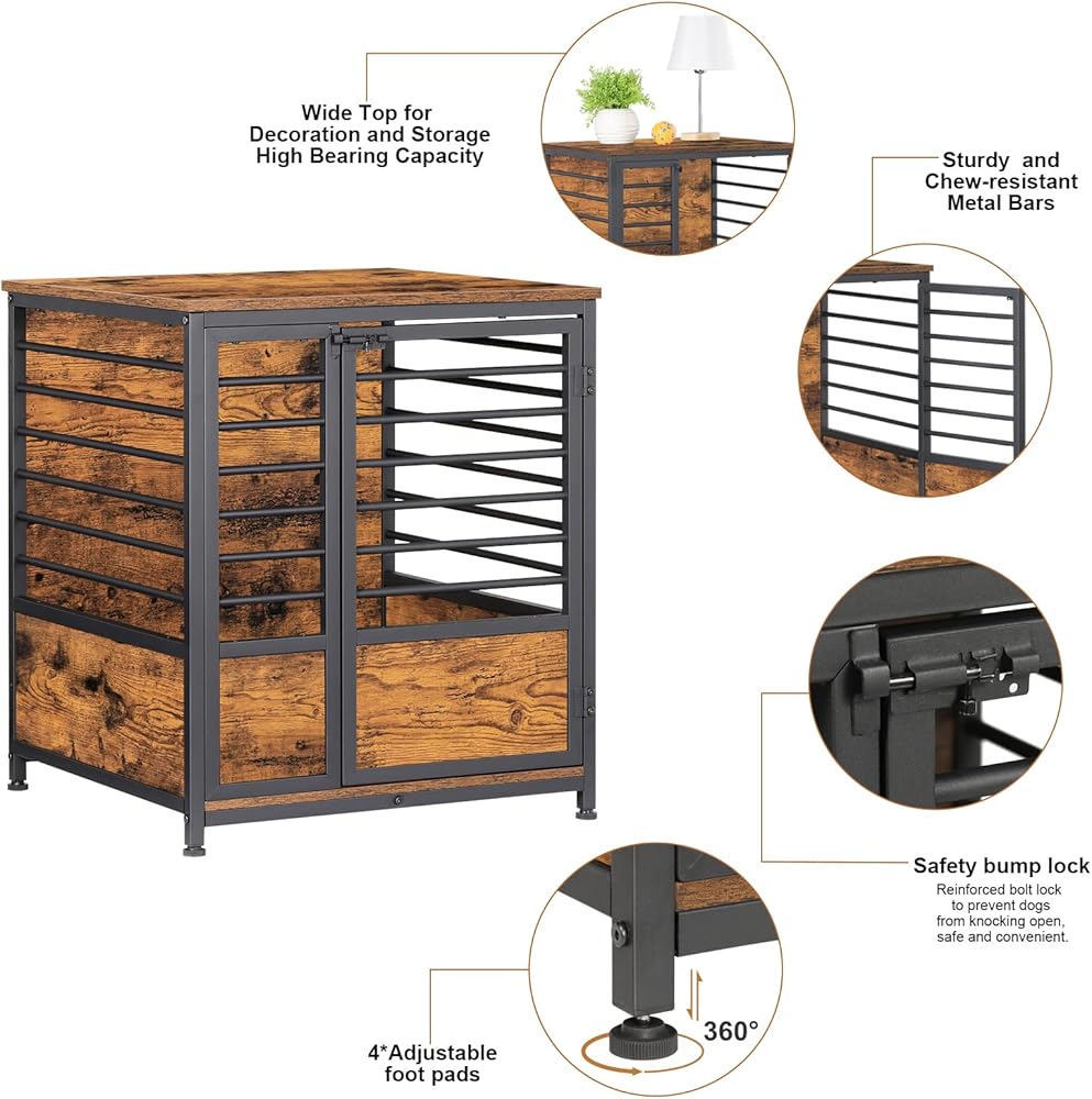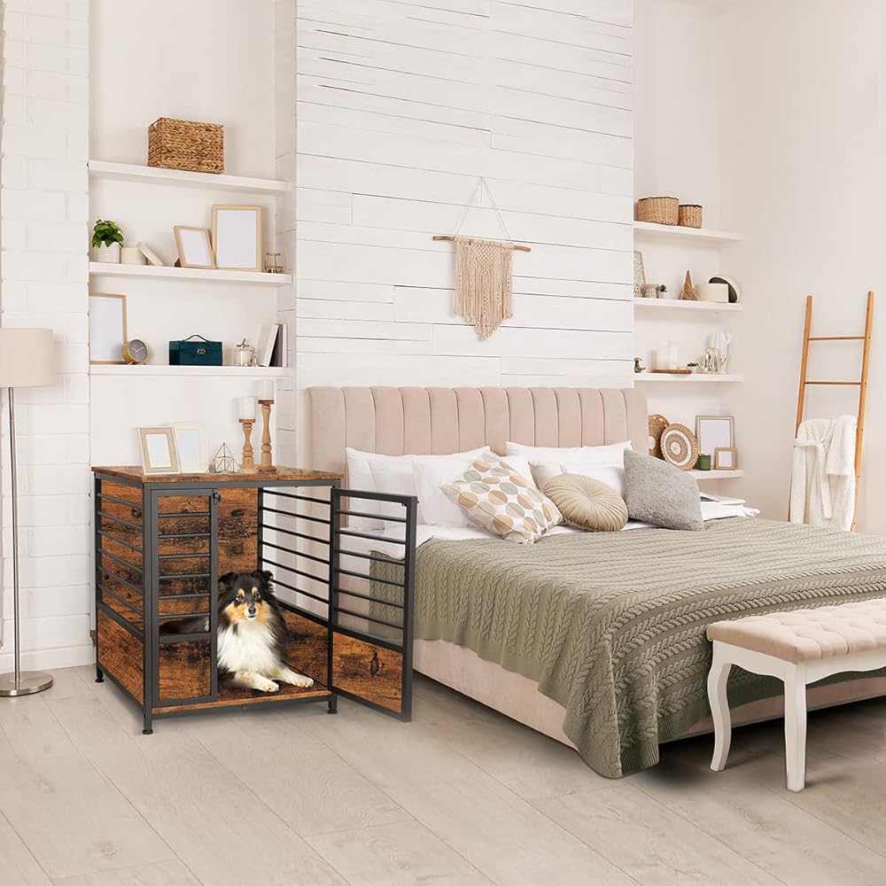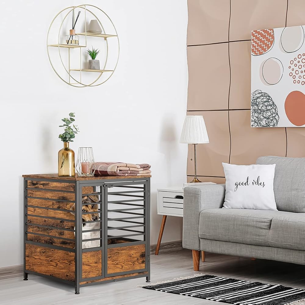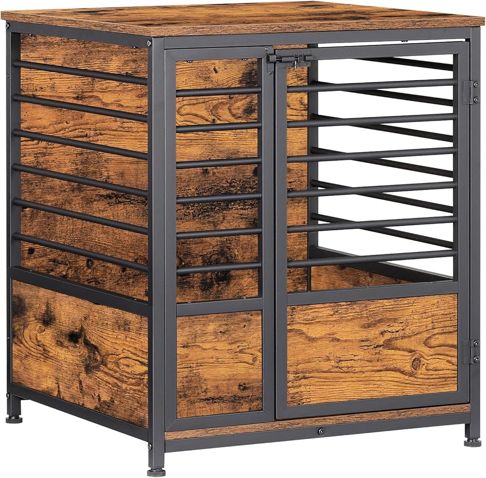 أثاث قفص الكلاب، طاولة نهاية جانبية لقفص الكلاب الخشبي شديد التحمل من ميلوس، بيت للكلاب داخلي، هيكل أنبوبي فولاذي بتصميم زخرفي، بيت قفص للحيوانات الأليفة للكلاب الكبيرة/المتوسطة/الصغيرة، بني ريفي