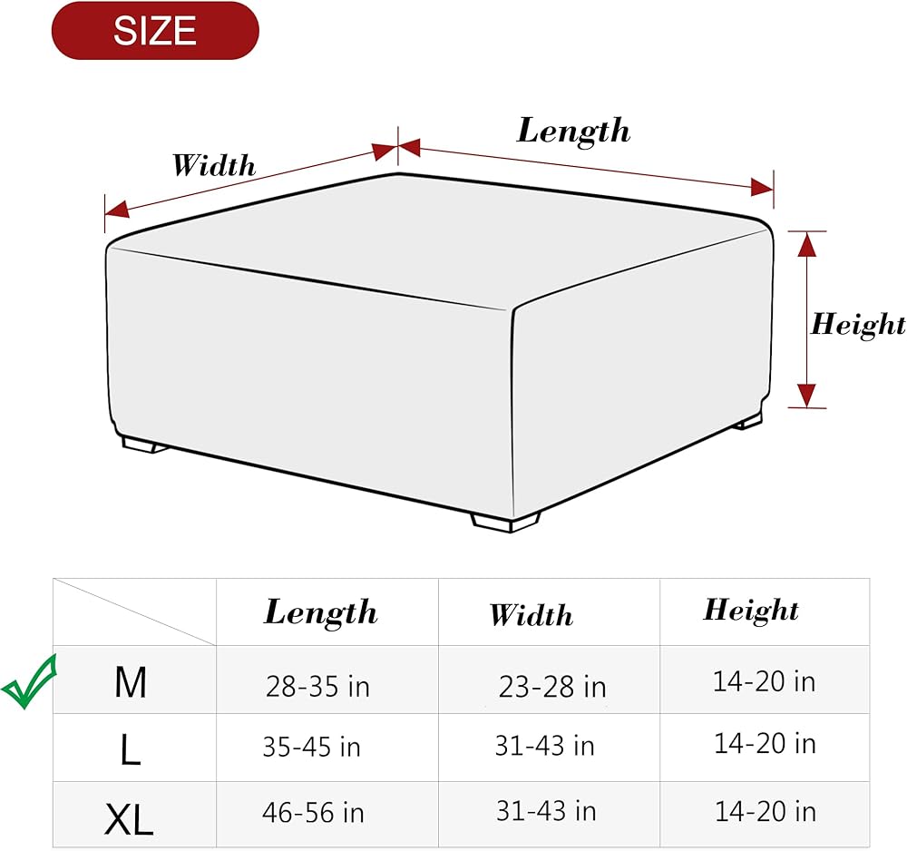 • ملاءمة رائعة: قابل للتمدد للغاية وحرفية تجعل هذا الغطاء المسند مناسبًا تمامًا لمعظم الأحجام. مقاس كبير يناسب طول المسند الذي يتراوح بين 35 بوصة - 45 بوصة؛ العرض: 31 بوصة - 43 بوصة، الارتفاع: 14 بوصة - 20 بوصة. يرجى قياس حجم العثماني الخاص بك قبل الشراء.