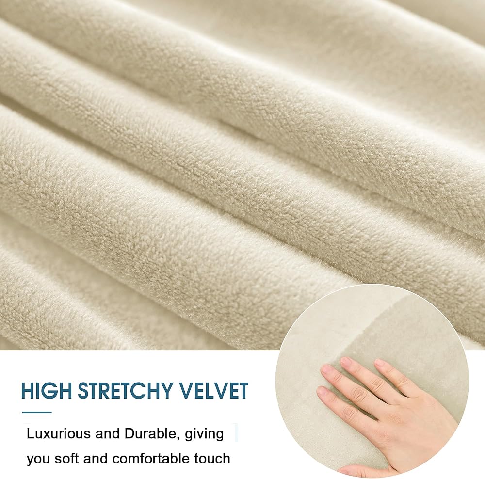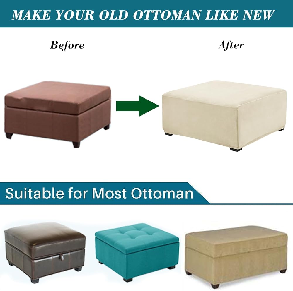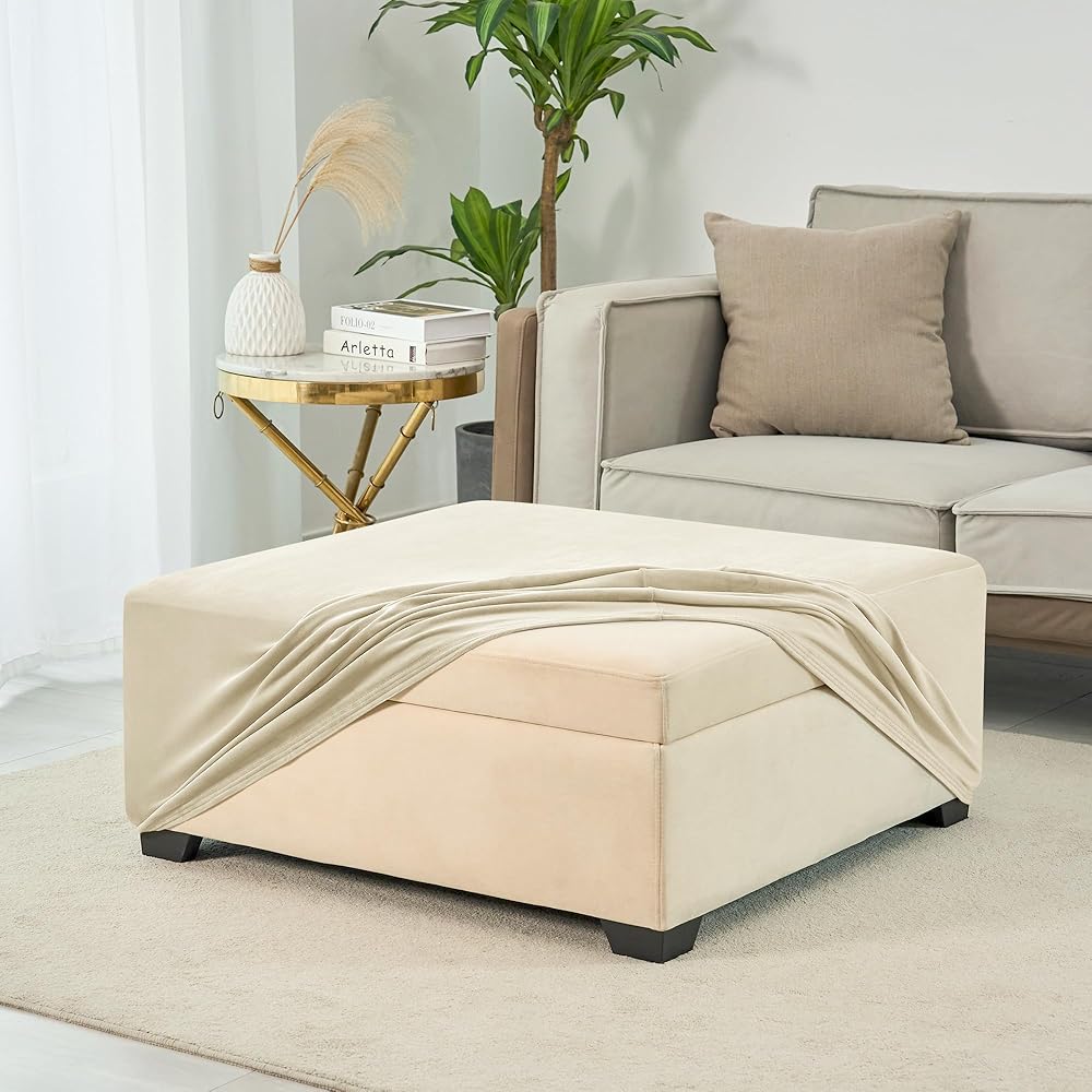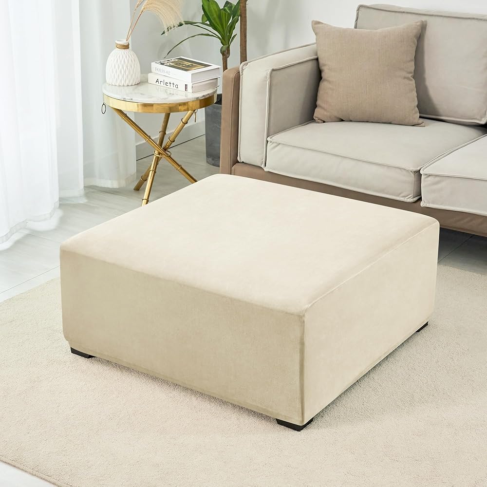 غطاء عثماني مربع الشكل مخملي قابل للتمدد - أغطية عثمانية مربعة ناعمة - غطاء عثماني سميك للتخزين غطاء مقعد للقدم مع قاعدة مرنة بيج متوسط