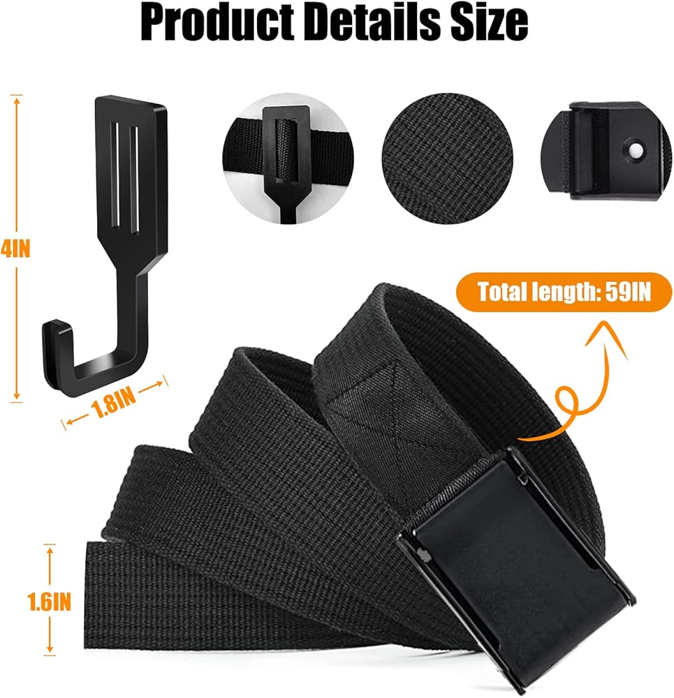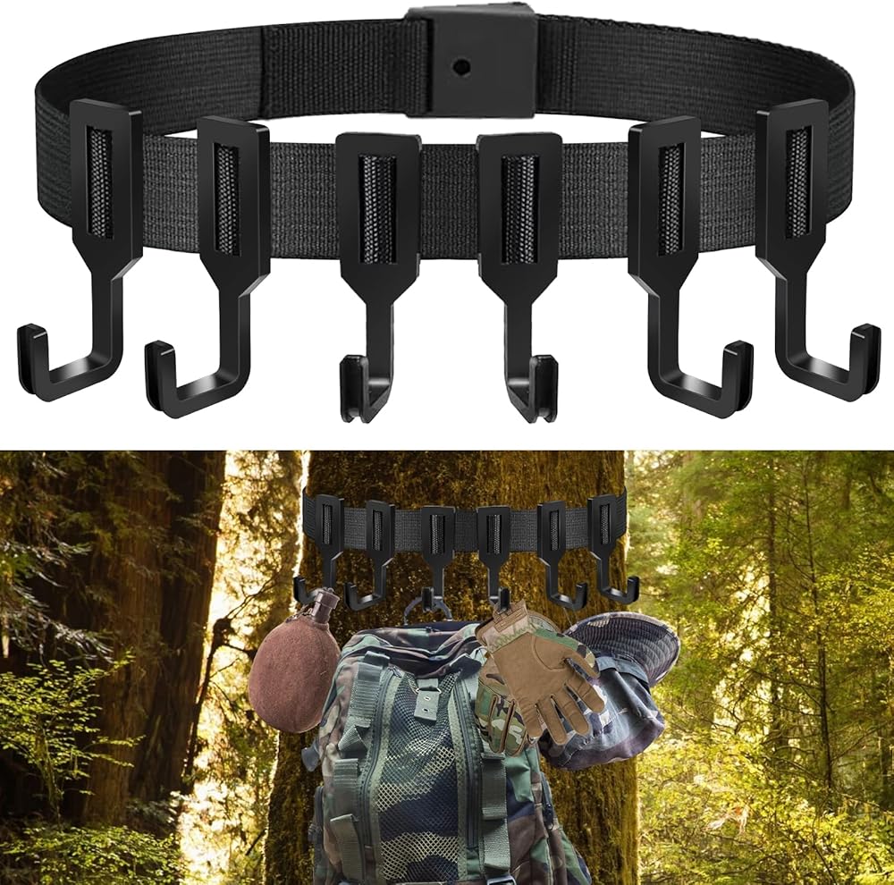 _xD83C__xDD65_SIZE: 1 tough strap and 6 strong Large Hanging hooks. The treestand strap measures about 150x4cm / 59x1.5inch, and the treestand hook measures about 10x4cm/3.9 x 1.5inch. Straps and hooks combination meet your hanging needs.