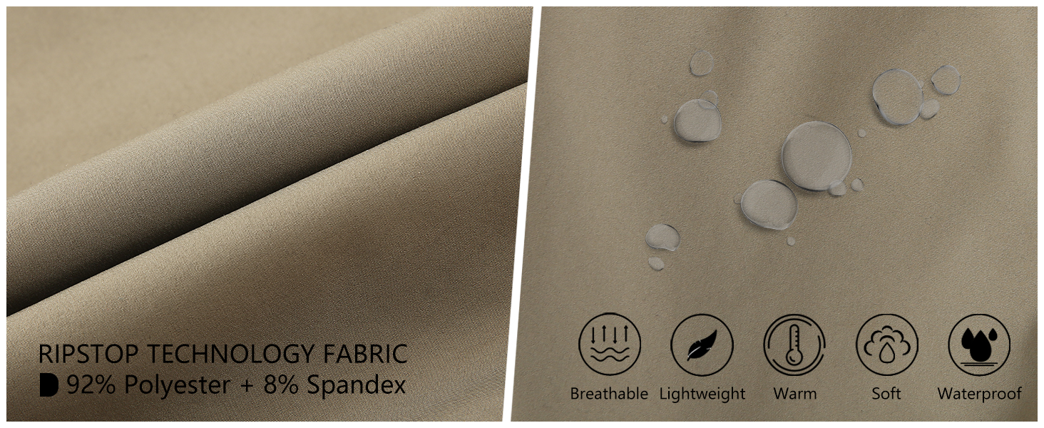 نسيج الغلاف مصنوع من 92% بوليستر و8% سباندكس، وهو مقاوم للماء والرياح والتآكل وسريع الجفاف ولا يوجد حبب ومعزول. البطانة الداخلية مصنوعة من الصوف الناعم الحبيبي للدفء والراحة.