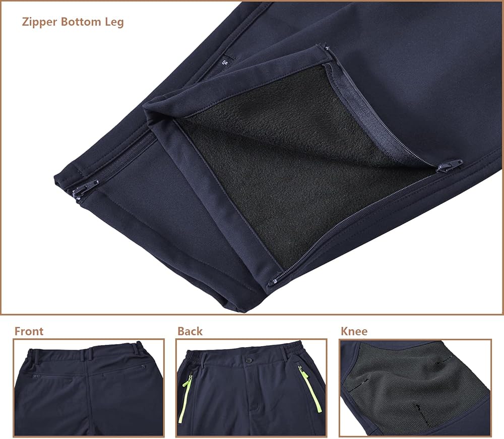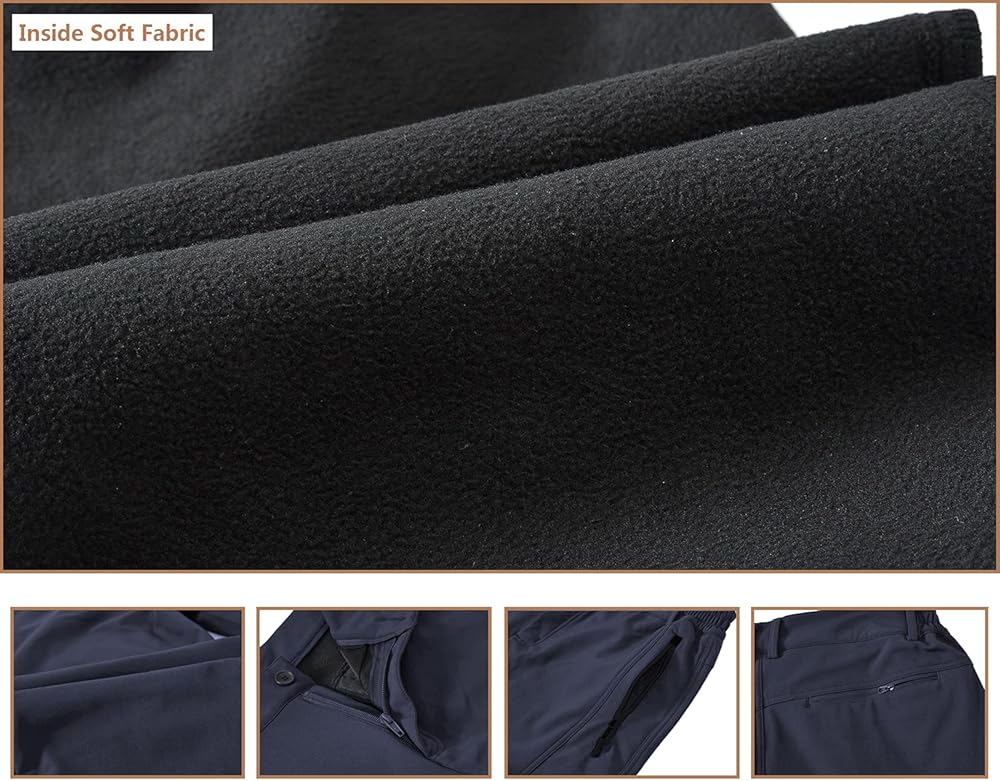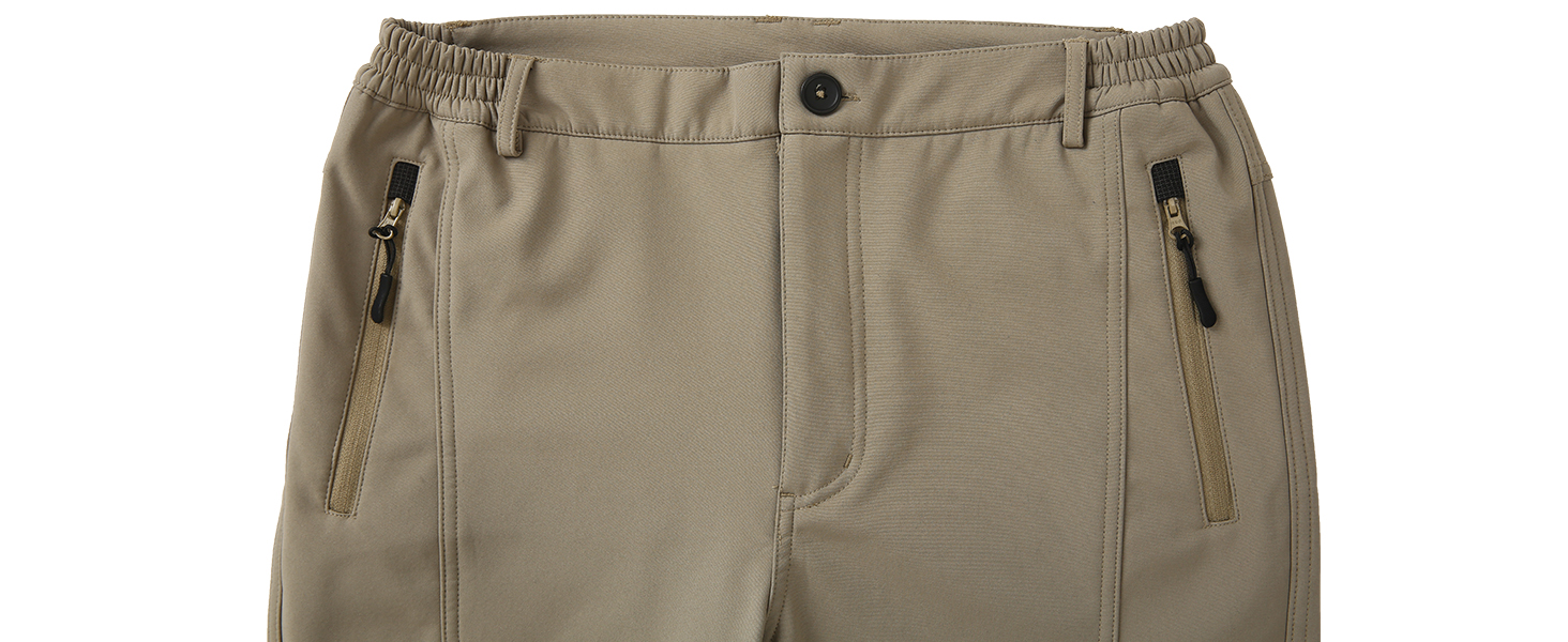 خصر مطاطي قابل للتعديل مع حزام يسمح للسراويل بملاءمة مريحة. 4 جيوب كبيرة بسحاب تحافظ على أمان هاتفك ومفاتيحك وبطاقات الائتمان والمتعلقات الشخصية الأخرى، وقماش داخلي قطيفة لمنع البرد الناتج عن المعدن.