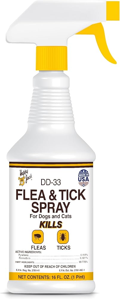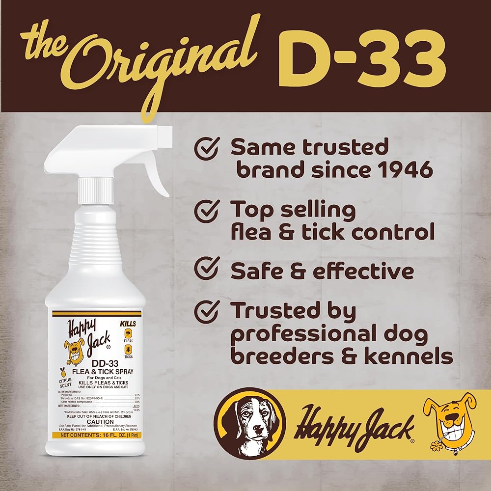 رذاذ البراغيث والقراد من هابي جاك DD-33 للكلاب والقطط، علاج البراغيث والسيطرة عليها، تركيبة مائية تقتل البراغيث والقراد بشكل فعال ولكنها لطيفة على الجلد والشعر، 16 أونصة