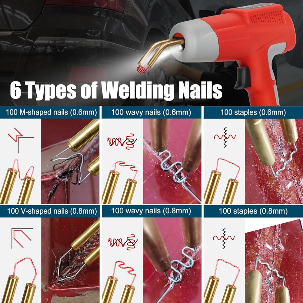 【6 Types 600pcs Staples】The plastic hot stapler comes with 6 types of staples for different repair and welding needs. 100 large wavy nails (0.8mm), 100 small wavy nails (0.6mm), 100 flat staples (0.8mm), 100 flat staples (0.6mm), 100 V-shaped nails (0.8mm), 100 M-shaped nails (0.6mm).