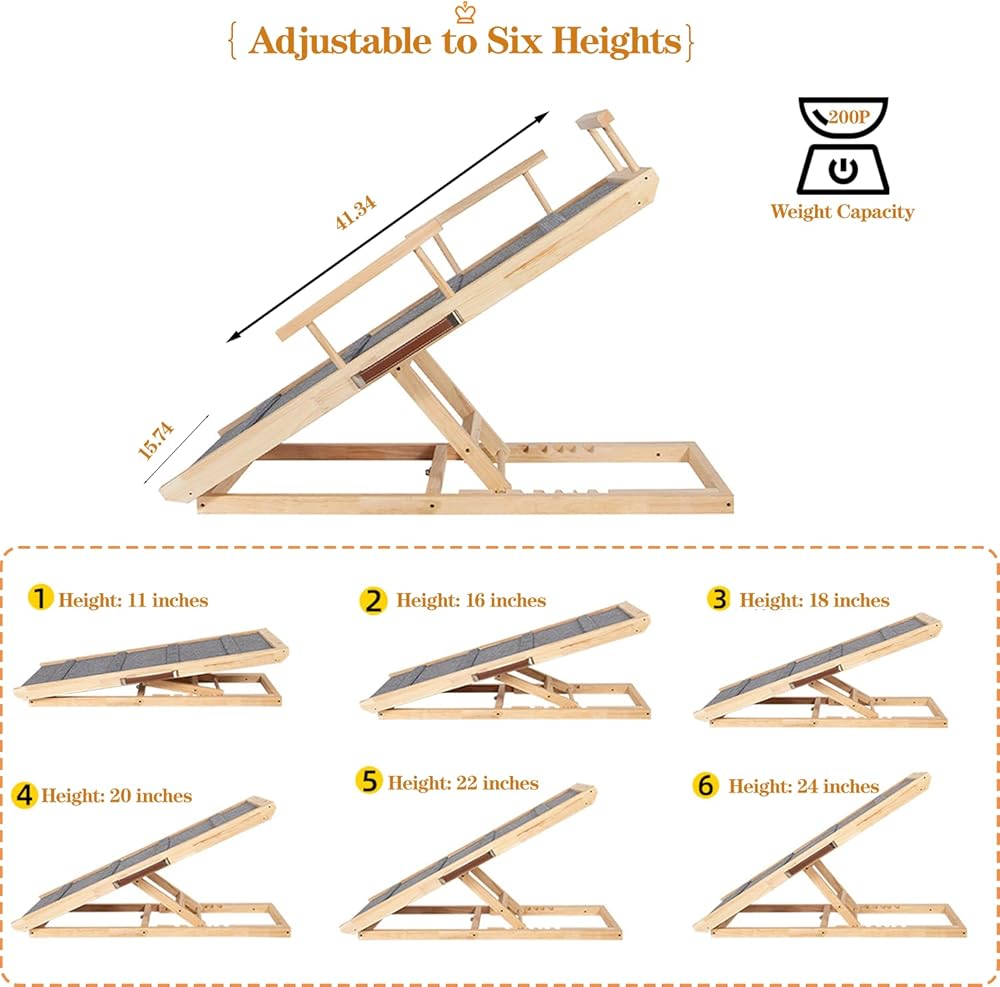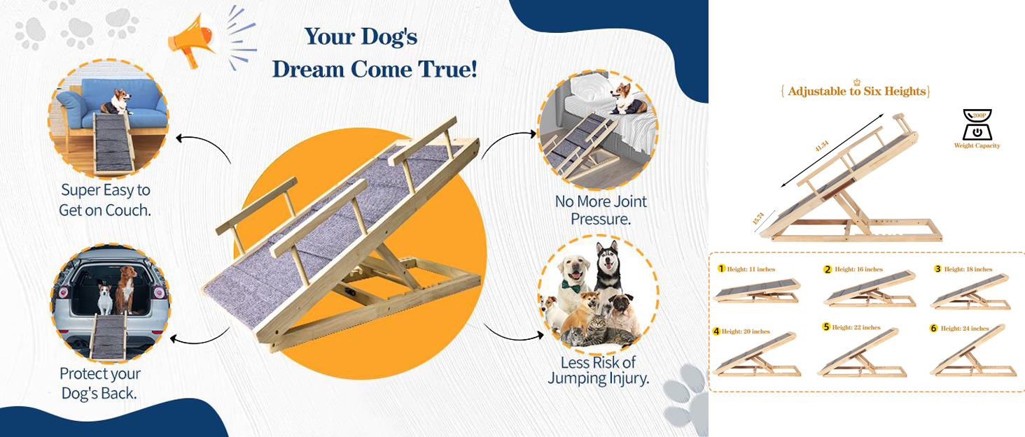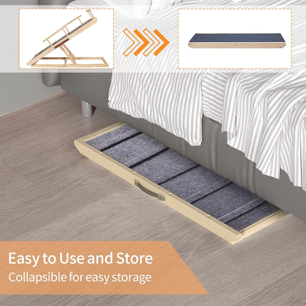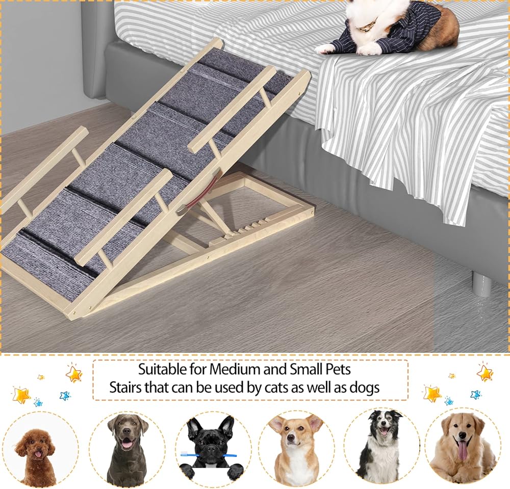 الأبعاد: 27.6 انش طول × 18.5 انش عرض × 19.5 انش ارتفاع؛ مقاس الدرج: 15.7 انش × 9.05 انش، هذا الدرج القابل للطي مناسب للحيوانات الأليفة الصغيرة والمتوسطة الحجم للوصول إلى الأرائك أو الأسرة