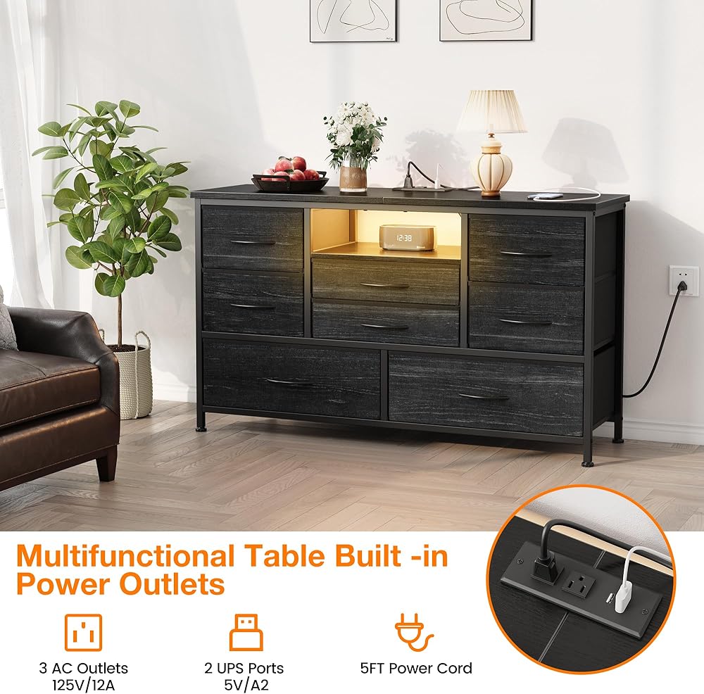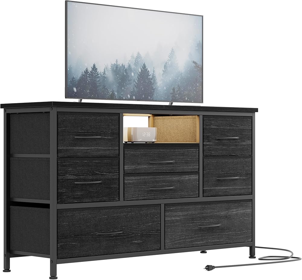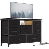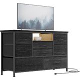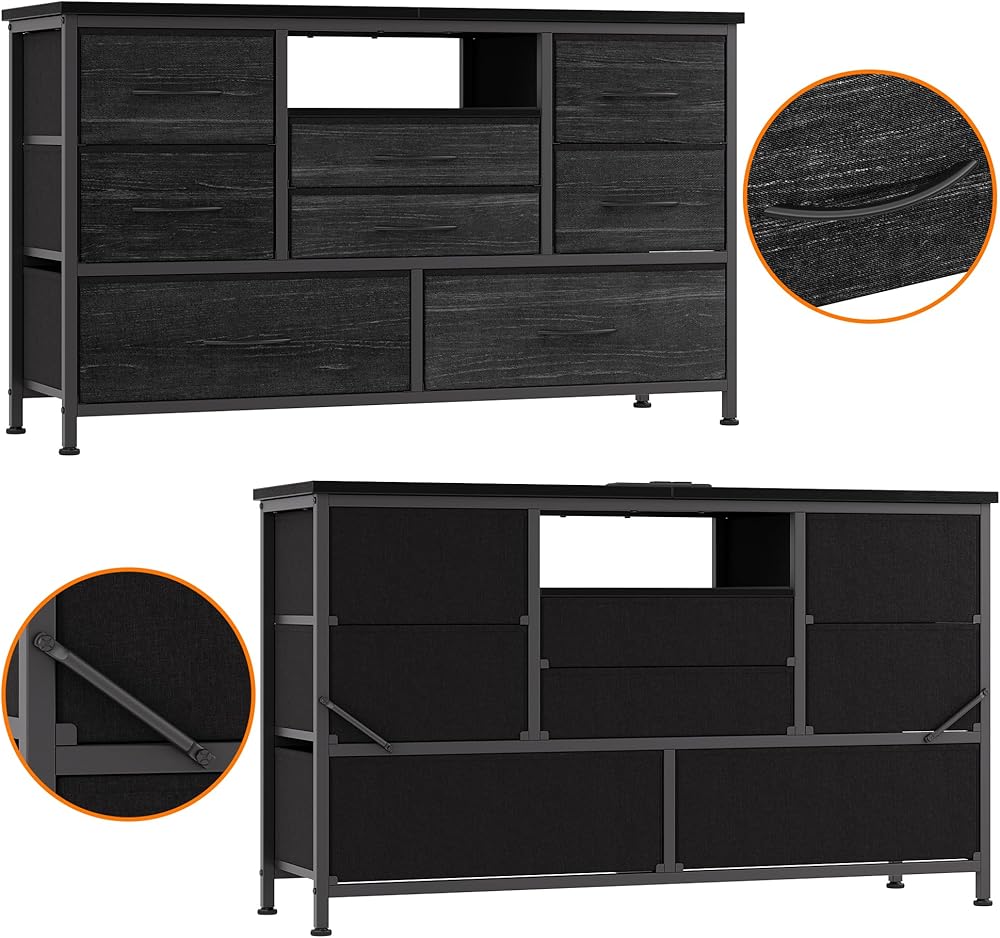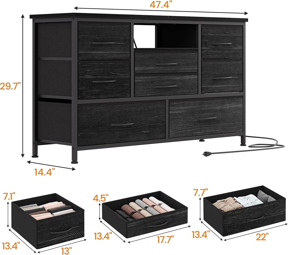 خزانة باتيكوين ذات 8 أدراج، برج تخزين قماشي لغرفة النوم، حامل تلفزيون واسع 47 بوصة وخزانة ذات أدراج مع منافذ تيار متردد ومنفذين USC، وحدة برج تخزين كبيرة، طباعة حبيبات من الخشب الأسود الفحمي