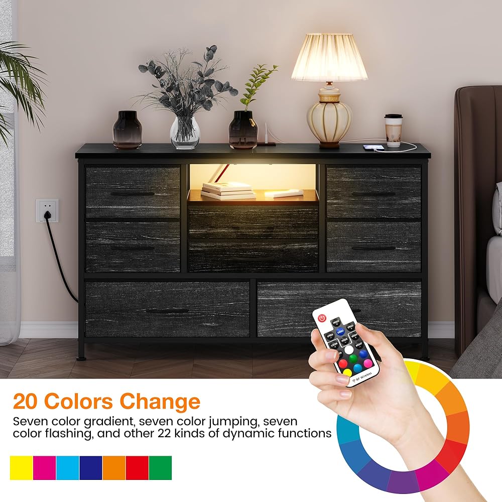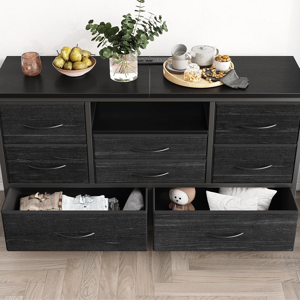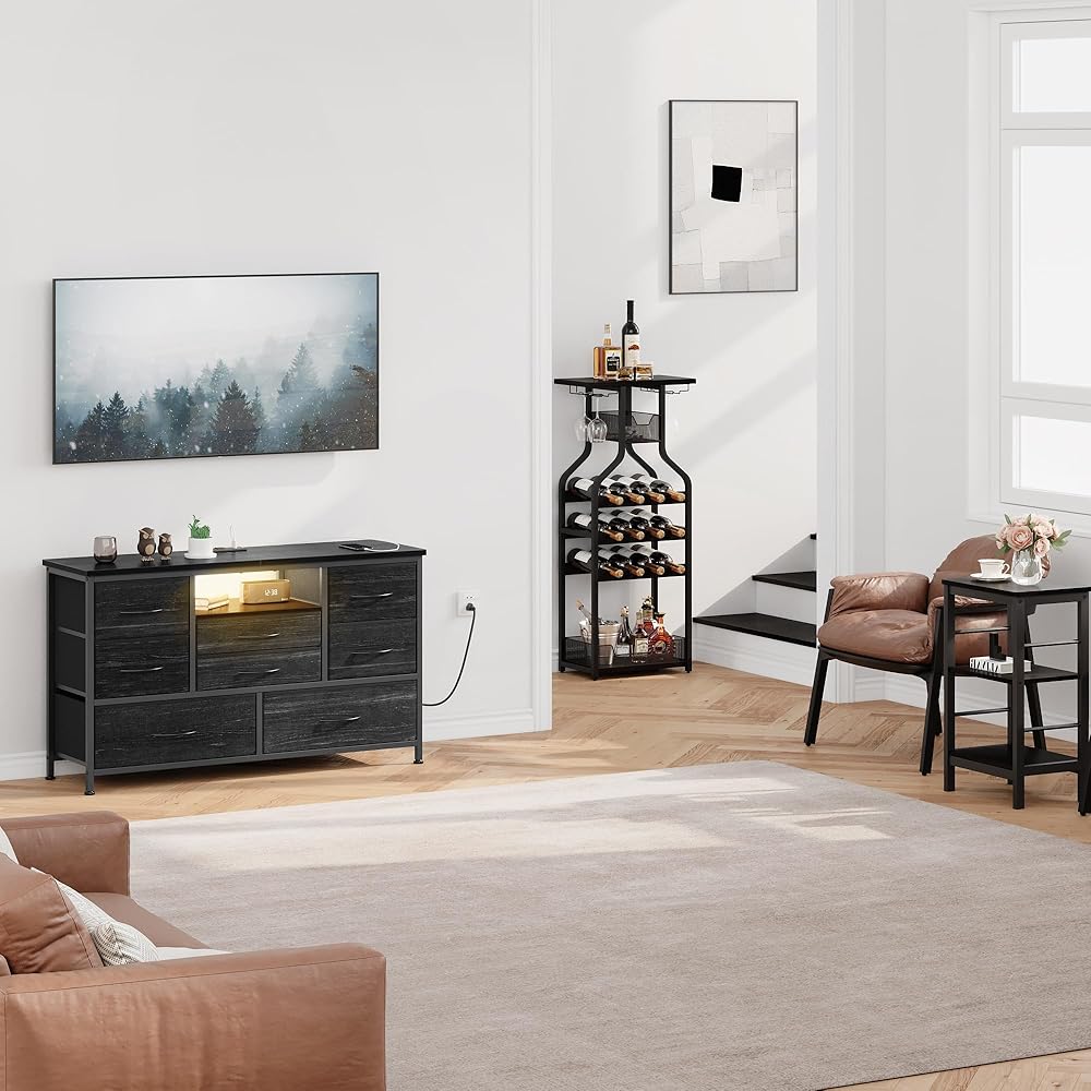 خزانة باتيكوين ذات 8 أدراج، برج تخزين قماشي لغرفة النوم، حامل تلفزيون واسع 47 بوصة وخزانة ذات أدراج مع منافذ تيار متردد ومنفذين USC، وحدة برج تخزين كبيرة، طباعة حبيبات من الخشب الأسود الفحمي
