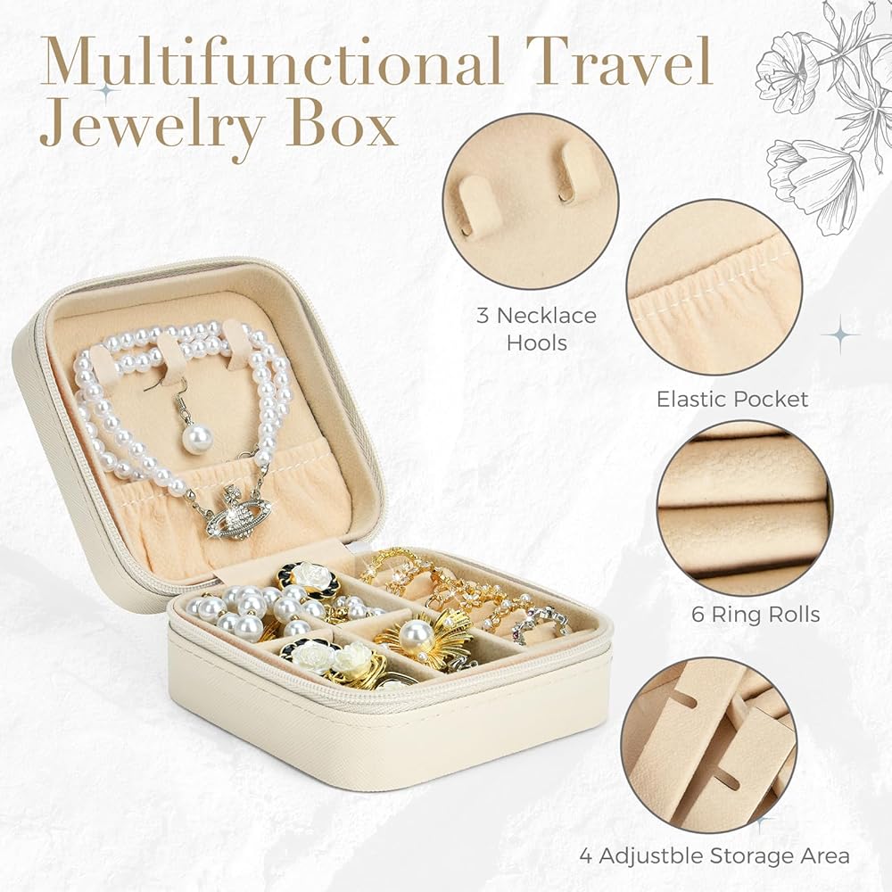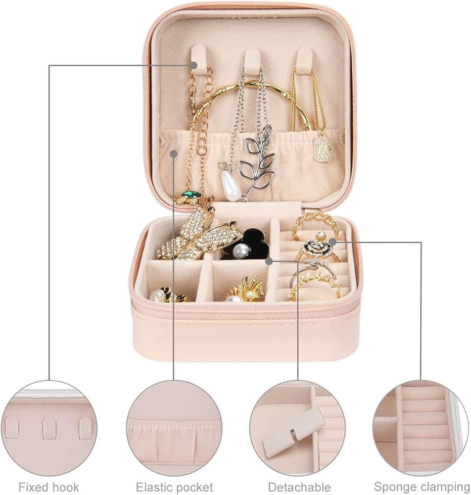 ☀ 【صندوق مجوهرات متعدد الوظائف】 يحتوي الجزء العلوي من منظم مجوهرات السفر على 3 خطافات لتعليق القلائد لمنع تشابك القلائد، ويأتي الجزء الداخلي لصندوق المجوهرات مع 6 لفات حامل حلقات، و20 مساحة مستطيلة قابلة للإزالة وحجرة قرط مطاطية. تصميم فتحة السحاب الناعمة يمكن أن يمنعك من فقدان مجوهراتك، خاصة عند السفر.
