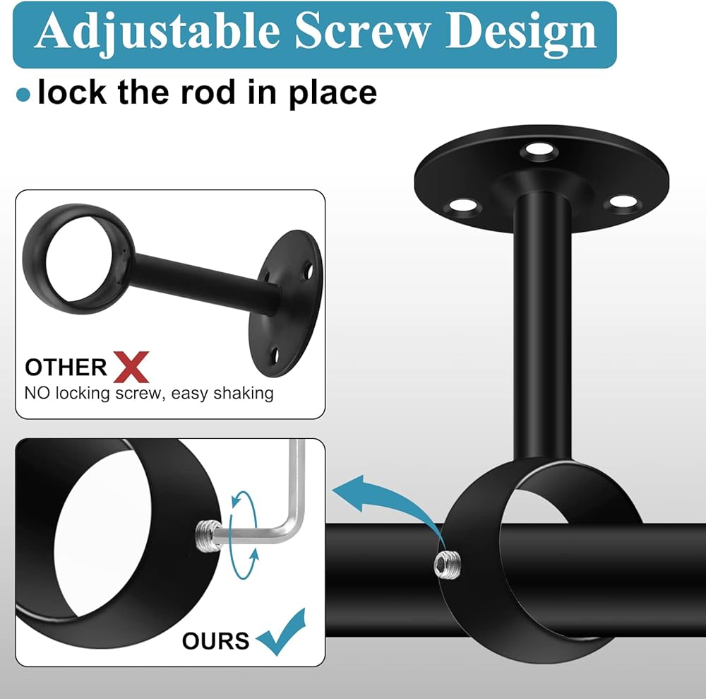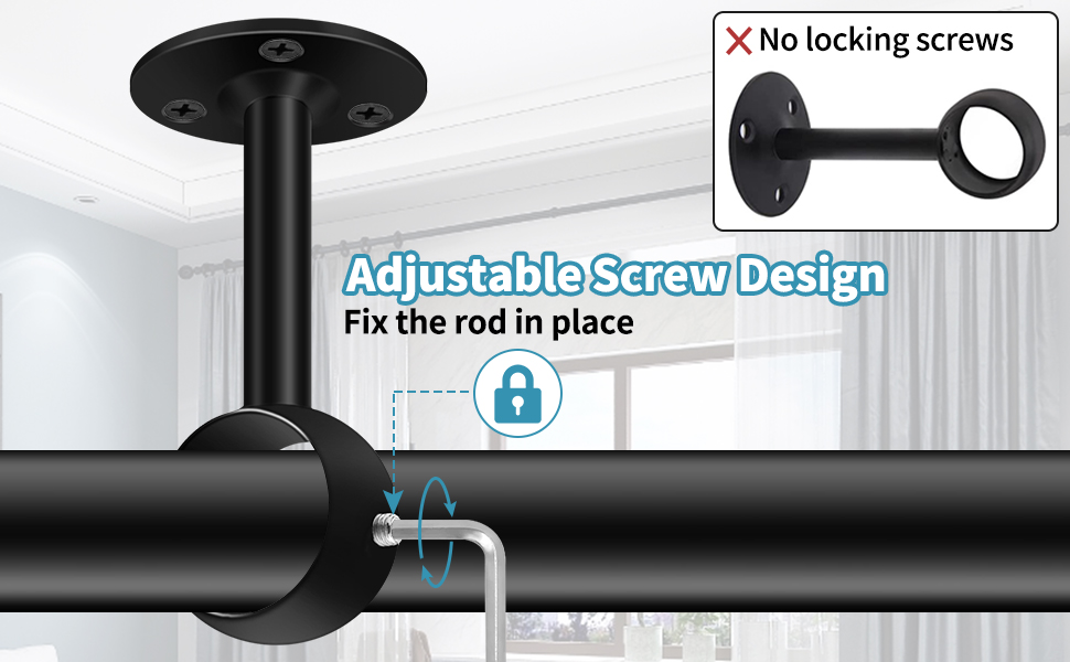 ✔️ تحتوي دعامة القضيب الواحد على برغي قابل للتعديل عند الفم لتثبيت قضبان الستارة وحماية القضيب من الاهتزاز.