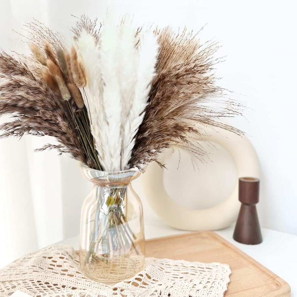 72pcs natural dried pampas herbs, natural pampa boho decor, fluffy flowers, boho home decoration, pampa bouquet, natural dried flowers, dried flower arrangement for wedding floral arrangements, home decoration Product Details: Material: natural dried plants Size: as picture Package Contents: 45 x natural colored pampas 10 x fluffy white pampas 2 x dust leaves15 x natural rabbit tails ğu. Features: These dry pom pom grass branches lose their fluffiness during transportation as it is a naturally dry plant. Open the package and shake it slightly. Place dried flowers in warm sunlight for several days. You can use a hair dryer to make them fluffy. Put them in a vase without water. Dried pampa grass consists of 100% natural ingredients that are non-toxic and harmless. Dried flower bouquet needs no daily care and pruning, will not fall off and fade. This pampa herb package is suitable for home, office, party, garden, hotel, coffee shop, festival, celebration, wedding, balcony, etc. as a rule. Pampa grass can also be used as a perfect gift to family and friends on special holidays. Put your finished dried flower arrangements in your favorite vase and enjoy the beautiful texture and color of Leaf decor and natural earth tones. Perfect as a birthday, conservatory, rescue, engagement or anniversary gift. Also great for making your own DIY dried flower wreath. Artificial branches made of pampa reed are the perfect contrast to any home decor, bedroom decor, living room decor and general home decor accessories