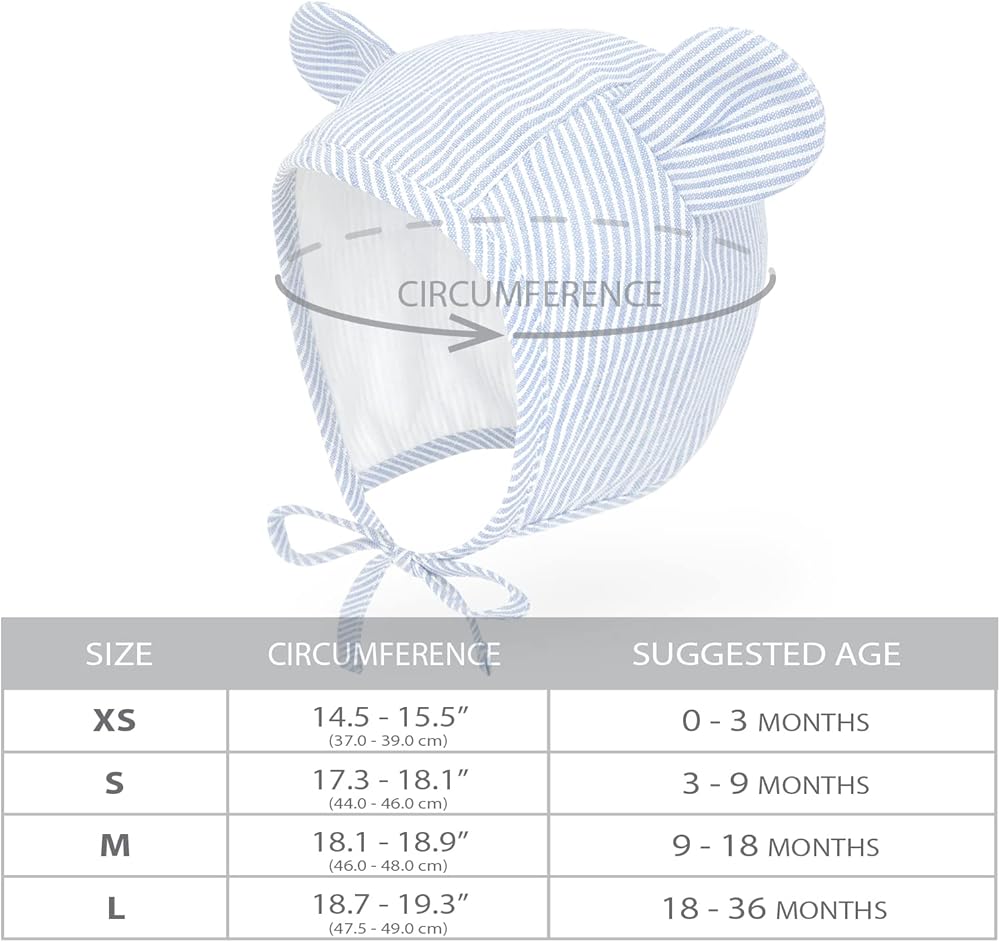 [المادة والمقاس]: 100% قطن مسامي، غطاء رأس مزدوج الطبقات مبطن بالكامل بالموسلين. المقاس المناسب للأعمار من 0 إلى 36 شهرًا (XS، S، M، L). يرجى التحقق من القياسات التفصيلية قبل تقديم طلبك. يرجى الأخذ في الاعتبار أن لون الشاشة والصور تحت الإضاءة المختلفة قد يختلف قليلاً عن المنتج الذي ستحصل عليه في المنزل.
