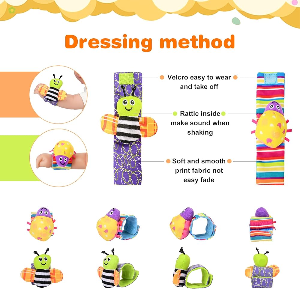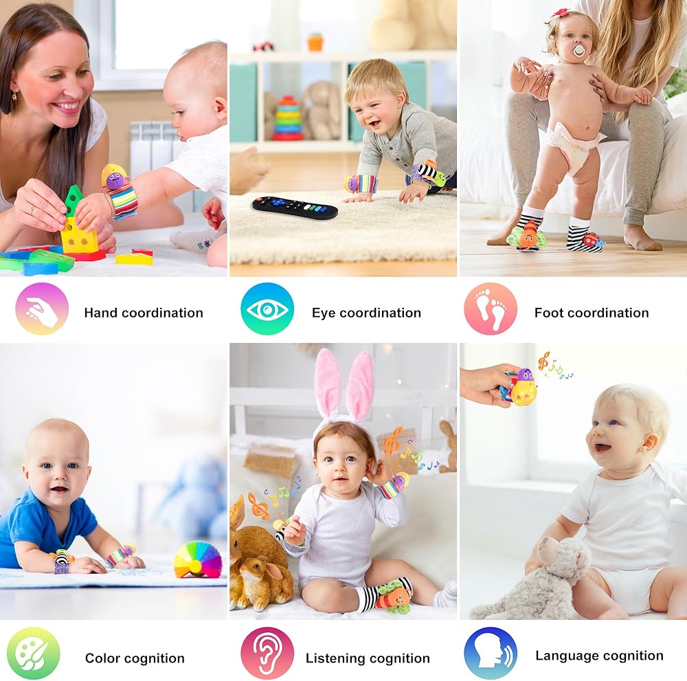 تعزز التطور الإدراكي: جوارب المعصم ألعاب الخشخشة لطفلك من عمر 6 إلى 12 شهرًا توفر تجربة 2 في 1، تجمع بين التحفيز البصري للألوان الزاهية والتحفيز السمعي لأصوات الخشخشة. مما يساعد على تعزيز التعرف على الصوت وتنمية البصر، وتشجيع طفلك الصغير. النمو المعرفي للفرد.