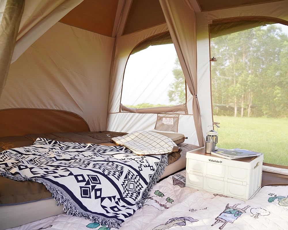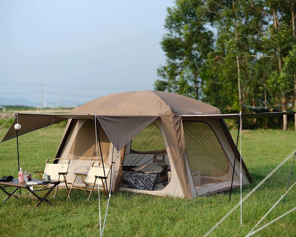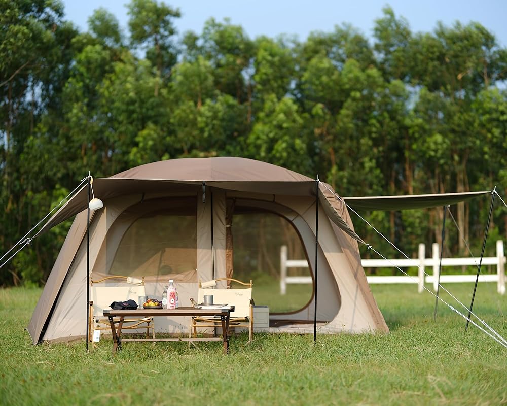 خيمة تتسع من 4 إلى 6 أشخاص: الخيمة مثالية للتخييم في الهواء الطلق من 4 إلى 6 أشخاص. بحجم 10.5 قدم × 6.8 قدم × 70.8 بوصة (ارتفاع) (71.4 قدم مربع). 2 مرتبة هوائية كوين (6.7 قدم × 5 قدم/200 سم × 150 سم، سمك أقل من 7.8 بوصة) أو 4-6 أكياس نوم مناسبة تمامًا للخيمة. مثالية للتخييم العائلي في الهواء الطلق.