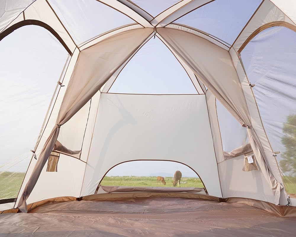 تهوية جيدة ومناظر خلابة للروائح: تحتوي هذه الخيمة التي تتسع لـ 4-6 أشخاص على 3 أبواب شبكية، ونافذتين شبكيتين وسطح خيمة شبكي، مما يسمح للنسيم بالدخول وإبعاد الحشرات. يتيح السقف الشبكي الكبير العلوي إمكانية مشاهدة النجوم بمنظر واسع في الليل.