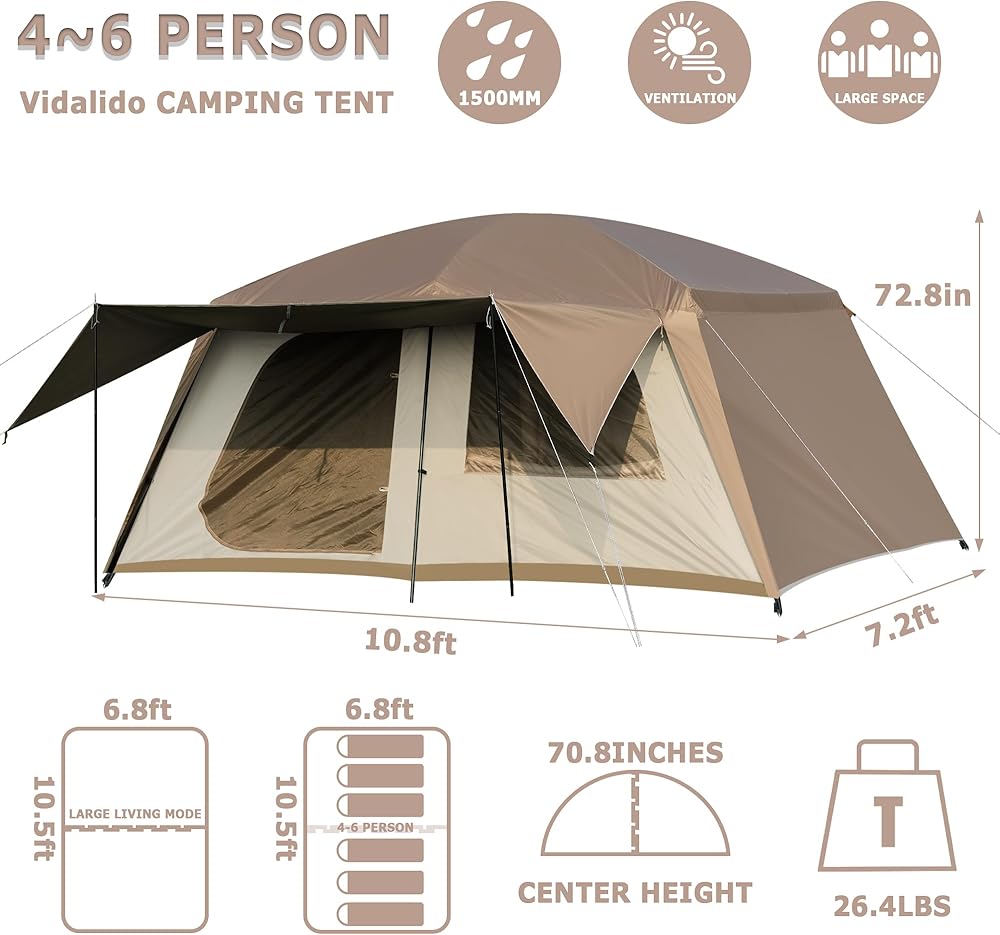 خيمة تخييم من 4 إلى 6 أشخاص من فيداليدو مع 3 أبواب وغرفتين خيام كابينة عائلية كبيرة، خيمة تخييم محمولة مقاومة للماء بطبقة مزدوجة، خيام كبيرة للتخييم في الهواء الطلق والمشي لمسافات طويلة وحقائب الظهر