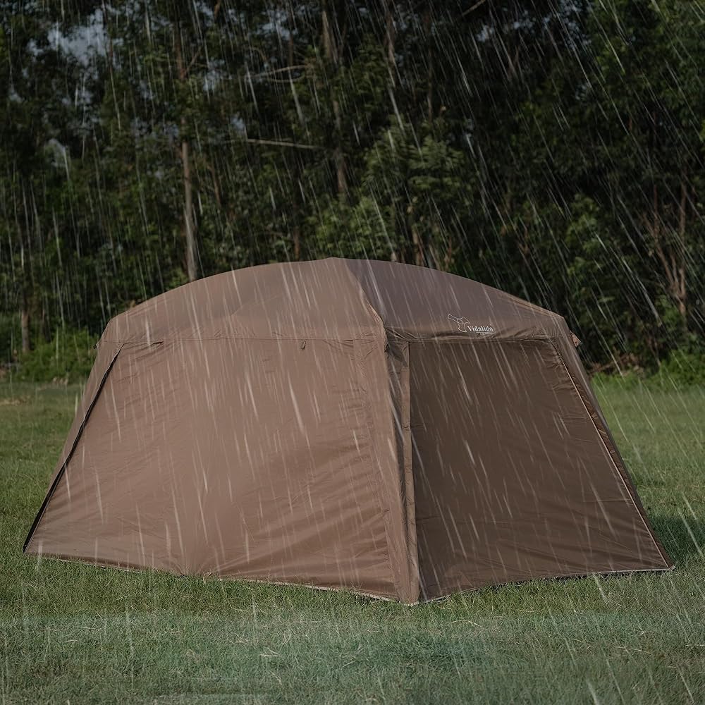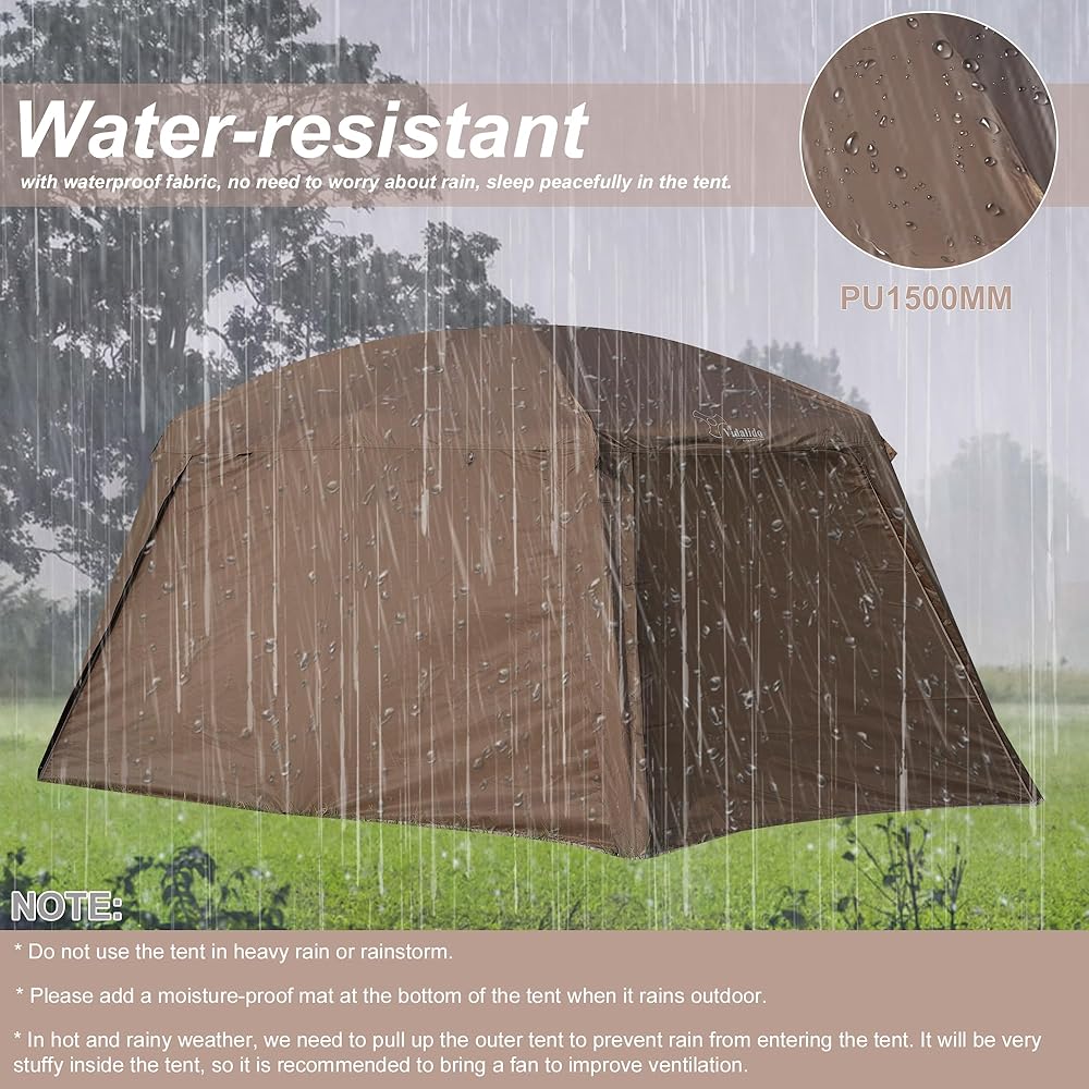 خامة عالية الجودة ومقاومة للماء: مصنوعة من بوليستر 150D مضاد للتمزق وقماش أكسفورد 200D لأداء يدوم طويلاً. مع طلاء البولي يوريثين الهيدروستاتيكي عالي التقنية بقطر 1500 مم، تضمن الخيمة مقاومة للماء حتى 1500 مم. تبقى الخيمة جافة تمامًا في الأيام الممطرة. مثالية للتخييم في الهواء الطلق والمشي لمسافات طويلة وصيد الأسماك في جميع الأحوال الجوية.