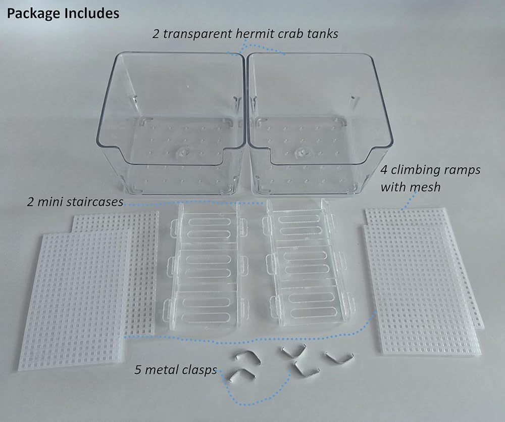 2 عبوة من خزانات مياه السلطعون الناسك الشفافة من الأكريليك مع سلالم صغيرة ومنحدر تسلق، مجموعة موائل السلطعون الناسك: حوض سمك سرطان البحر صغير/متوسط مع ملحقات حمام السباحة بالمياه المالحة