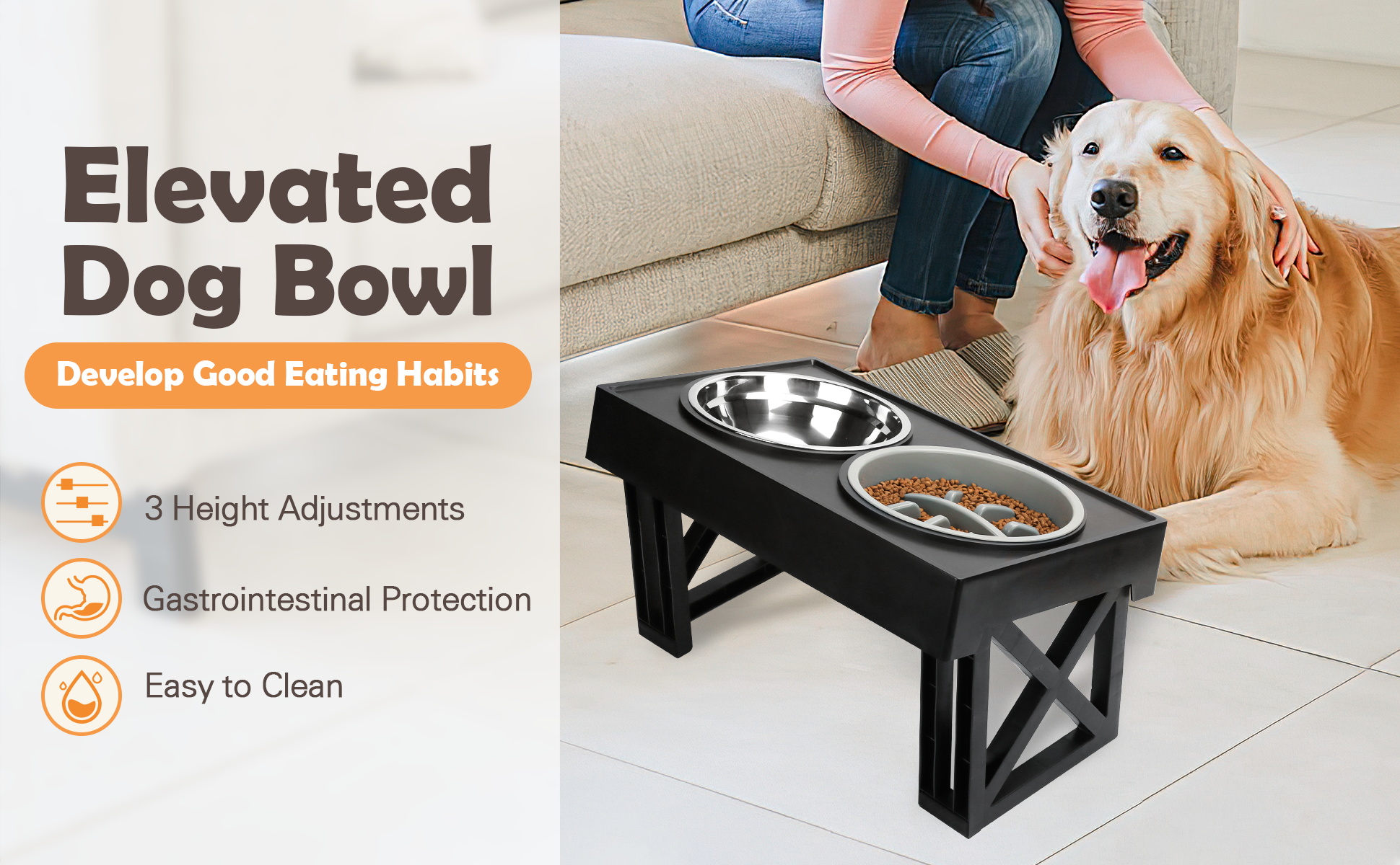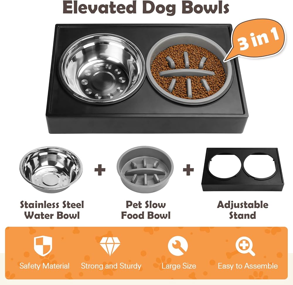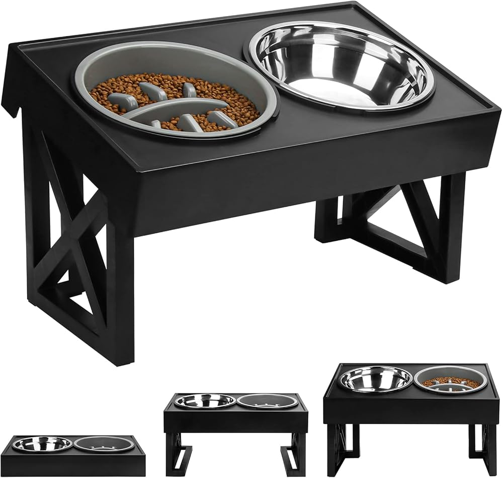【Slow Food Bowl】 The bowl with a professionally designed slow food bowl can effectively control the pet's eating speed, prolong the pet's feeding time, reduce the probability of pet obesity, and improve the healthy digestion of the gastrointestinal tract.Note: A raised dog bowl placed against a wall will be more stable when your dog is eating and they will not knock it over. When the height is adjusted to the maximum height, the elevated dog bowl will be tilted at an Angle.