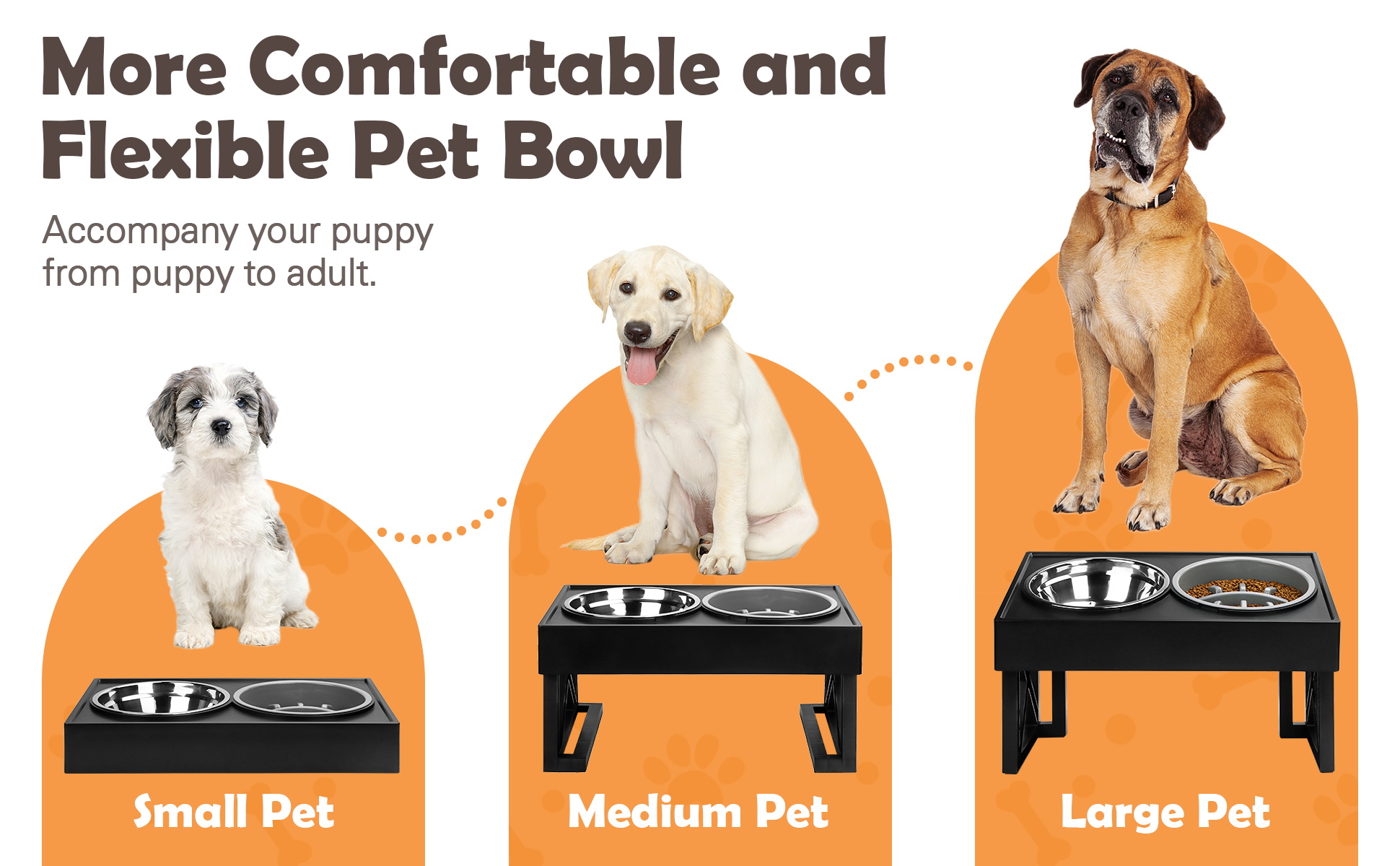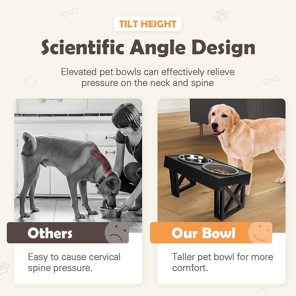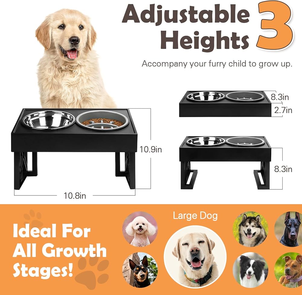 【3 Adjustable Height Settings】You can adjust the elevated dog bowls to 3 heights, which is suitable for your dogs from puppy to senior,the raised dog bowl can be adjusted to 11.8 inch for large dogs, 7.8 inch for medium dogs and 2.5 inch for small dogs