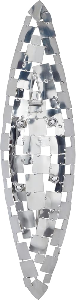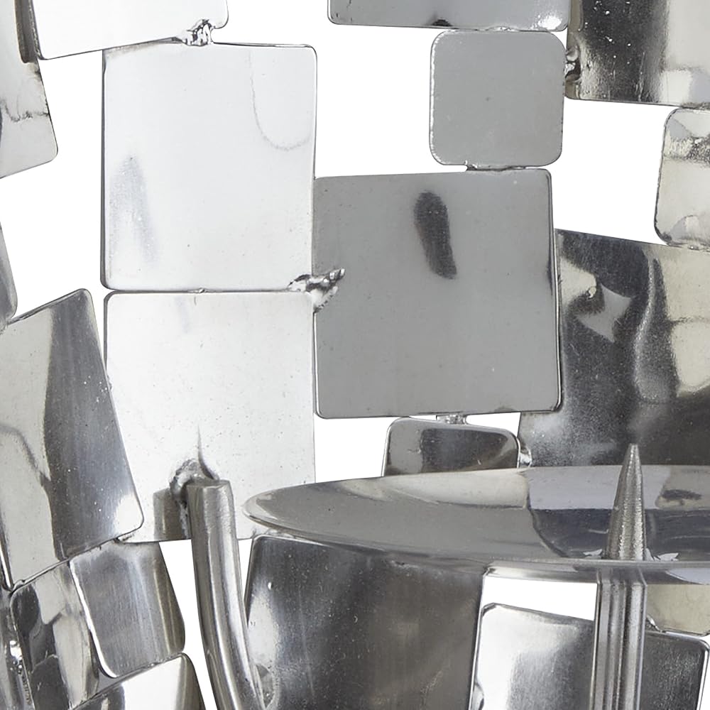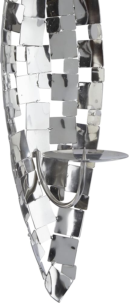 FEATURES GEOMETRIC WALL SCONCE: A contemporary candle holder featuring a diamond-shaped frame in a silver finish designed with fragments of square stainless steel sheets attached to a sturdy round metal plate that can accommodate votive or pillar candles